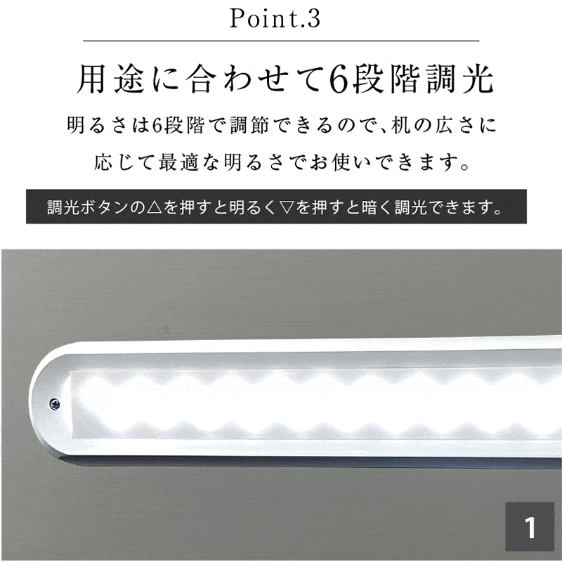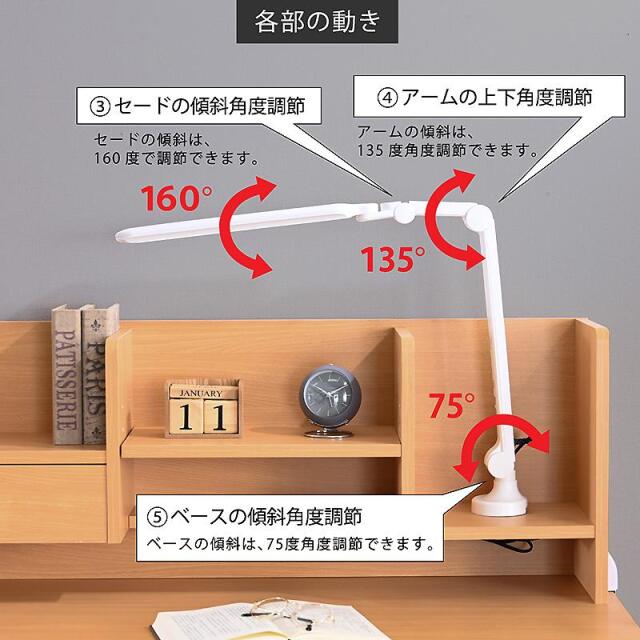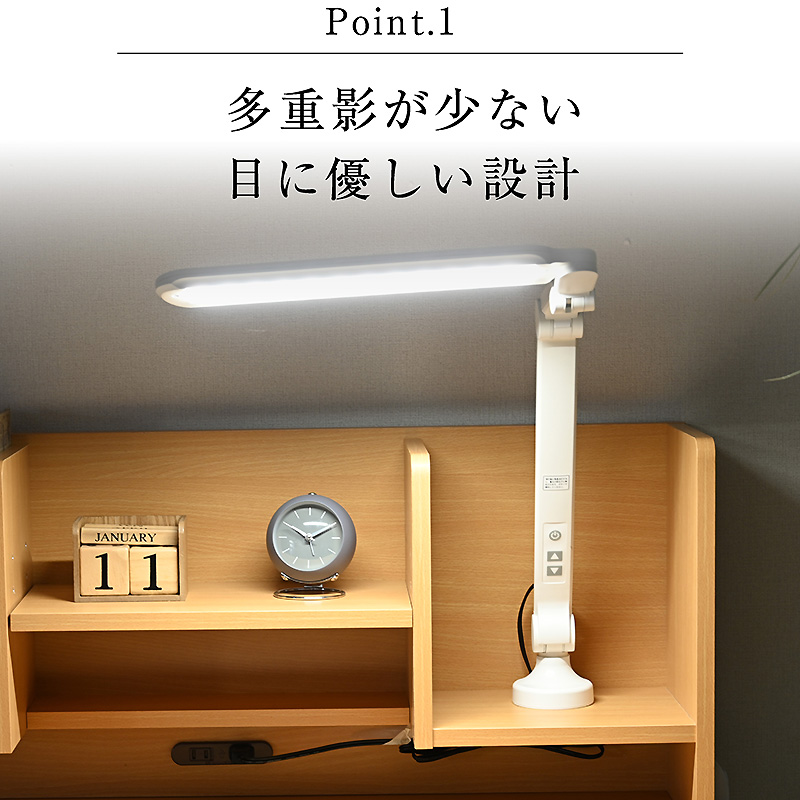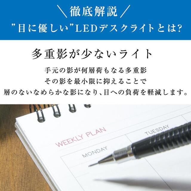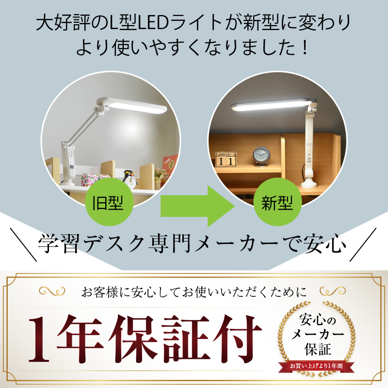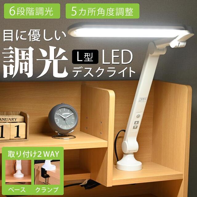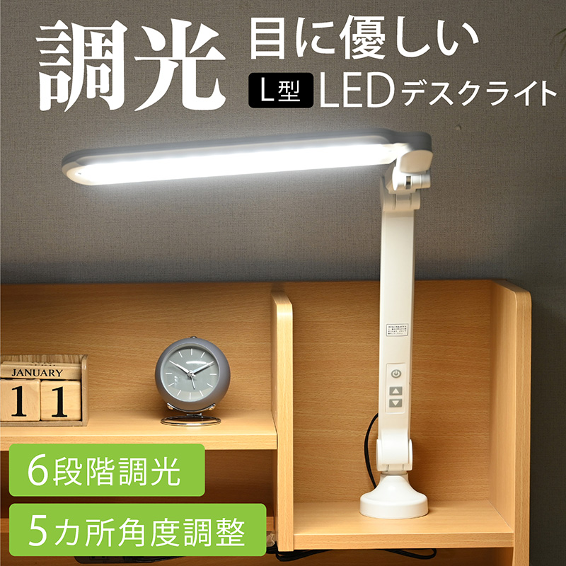 仕様 ・定格電圧:100V ・定格周波数:50/60Hz ・消費電力:7W ・使用ランプ:LED ・電源コード長:約2.1m ・使用場所:屋内用 当店のおすすめポイント \目にやさしい光で快適な作業を/ 省エネ&6段階調光式 L型LEDデスクライト ・使い易い正面ON/OFFスイッチ ・便利な6段階調光 ・5箇所稼働でき、ていろんな角度調整できる ・多重影少なく目の負担を軽減 ・長寿命/低電力のLEDライト採用で節電効果も高く経済的 ・LEDはちらつきが少なく目にも優しくデスクライトに最適 送料 送料無料 ただし、北海道・東北地方・沖縄は追加送料が必要となります。(離島は別途お見積り) ご注意 ※メーカー1年保証※ 必ず保証書を記載の上、保管をお願いします。 ・机にネジで固定する際、机によってはネジ1本で固定する場合があります。 ・ロット違いにより色味が若干異なる場合がございます。 ・曲線部分や若干の個体差により、多少の誤差が生じることがございます。 ・商品は予告なく仕様が変更される場合があります。 ・レビューは、旧型を含んでいます。