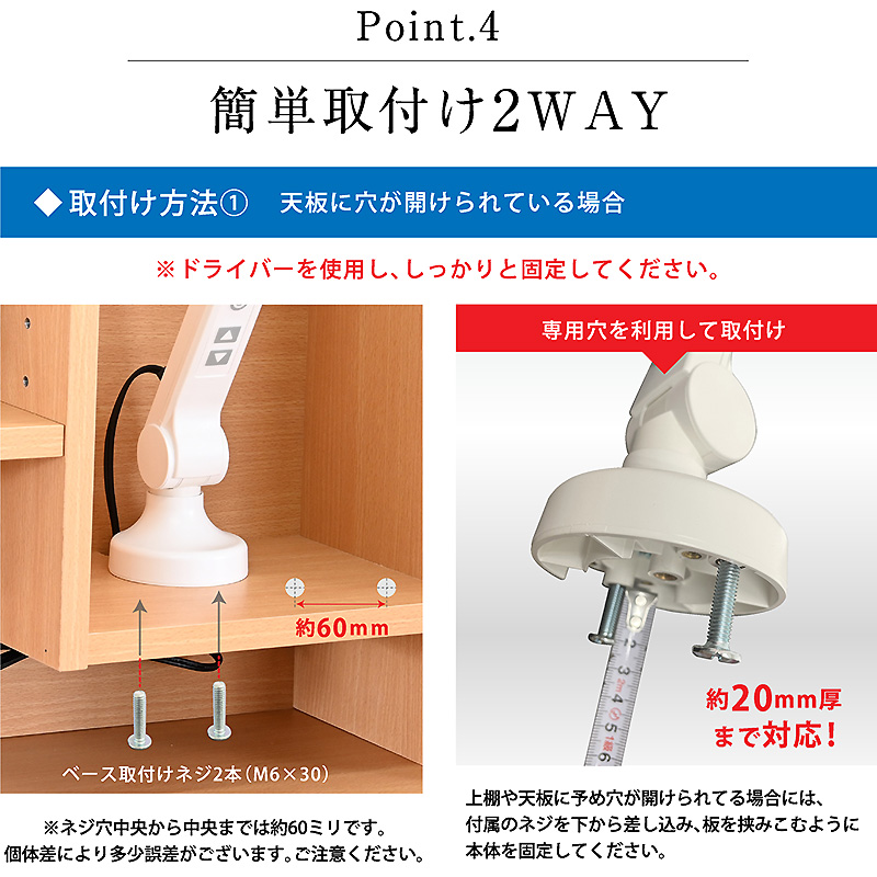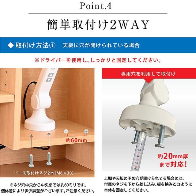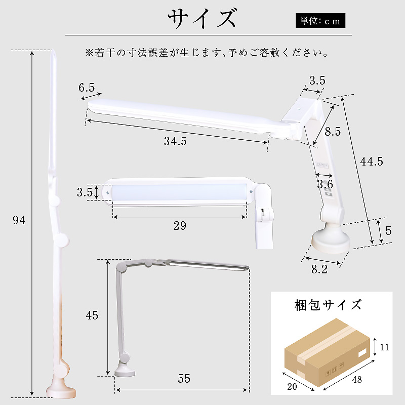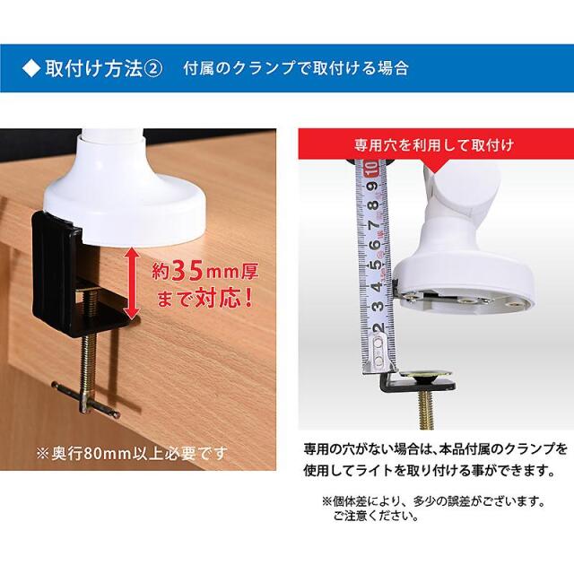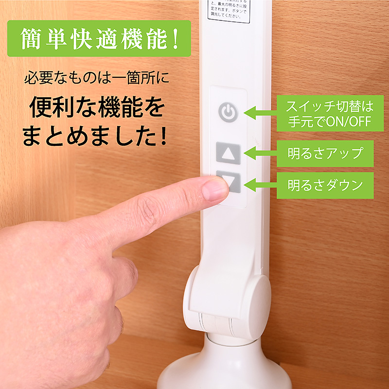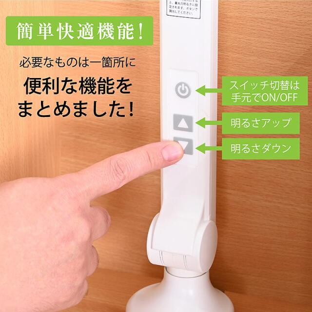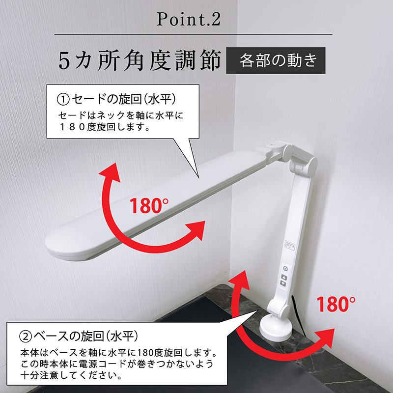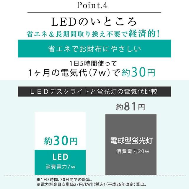 仕様 ・定格電圧:100V ・定格周波数:50/60Hz ・消費電力:7W ・使用ランプ:LED ・電源コード長:約2.1m ・使用場所:屋内用 当店のおすすめポイント \目にやさしい光で快適な作業を/ 省エネ&6段階調光式 L型LEDデスクライト ・使い易い正面ON/OFFスイッチ ・便利な6段階調光 ・5箇所稼働でき、ていろんな角度調整できる ・多重影少なく目の負担を軽減 ・長寿命/低電力のLEDライト採用で節電効果も高く経済的 ・LEDはちらつきが少なく目にも優しくデスクライトに最適 送料 送料無料 ただし、北海道・東北地方・沖縄は追加送料が必要となります。(離島は別途お見積り) ご注意 ※メーカー1年保証※ 必ず保証書を記載の上、保管をお願いします。 ・机にネジで固定する際、机によってはネジ1本で固定する場合があります。 ・ロット違いにより色味が若干異なる場合がございます。 ・曲線部分や若干の個体差により、多少の誤差が生じることがございます。 ・商品は予告なく仕様が変更される場合があります。 ・レビューは、旧型を含んでいます。