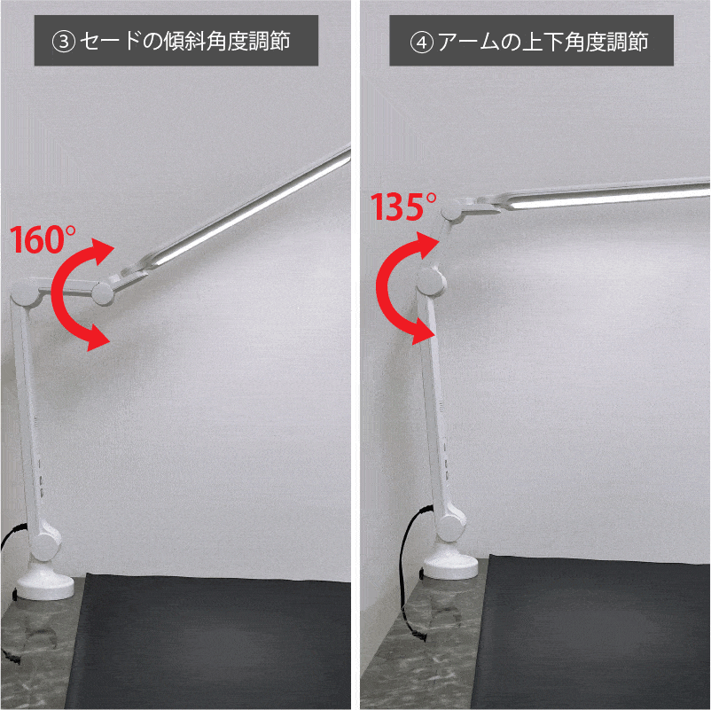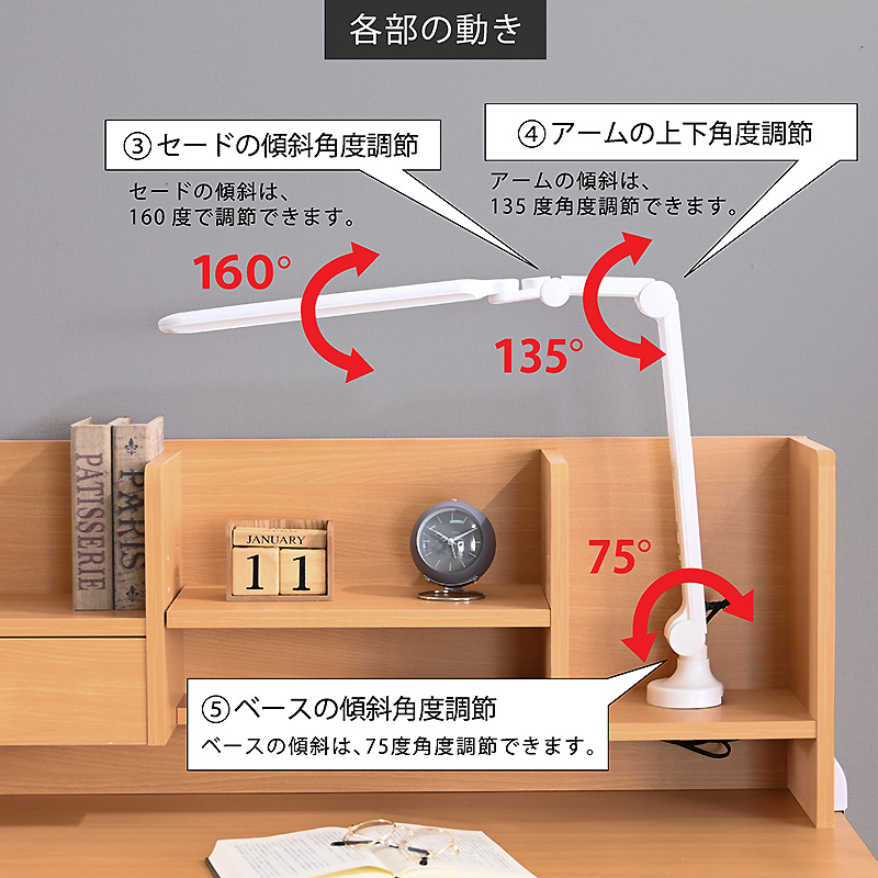 ・ON/OFFスイッチ ・コンセント ・調光式 ・アーム上下調節ネジ ・電源コード ・セード前傾調節ネジ |
