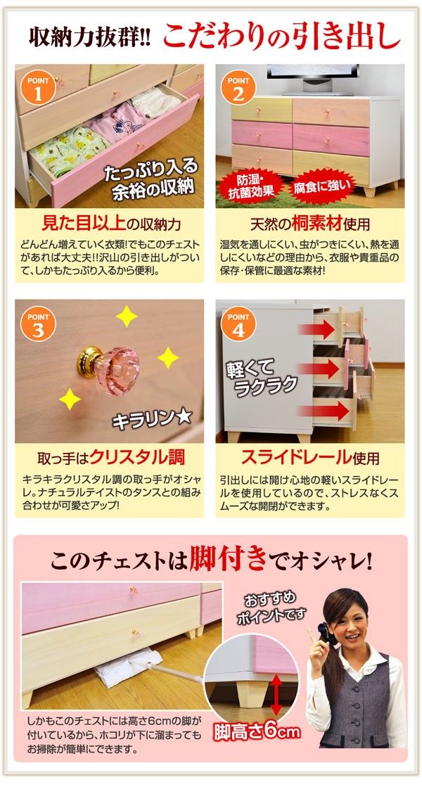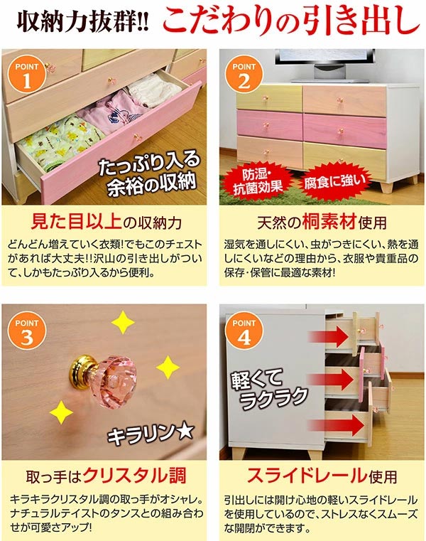 【完成品】 ポップなカラーでお部屋が明るくなります 組立不要ですので、お届け後すぐにご使用いただけます。 桐材を使用しておりますので、防虫・防カビ・防臭などの特徴があります どのお部屋にもピッタリ、3タイプご用意 ※レビューは旧型を含みます。ご了承ください。 |