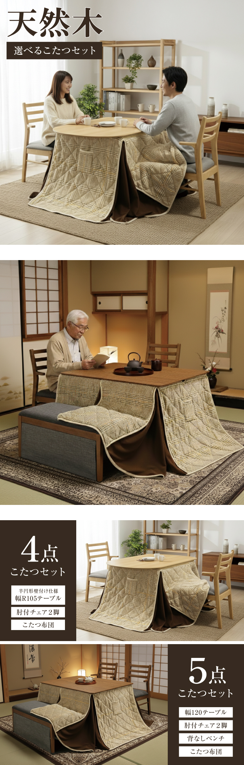| セット内容 | ・ダイニングこたつ4点セット 幅105テーブル(半円形)、肘付チェア2脚、こたつ布団 ・ダイニングこたつ5点セット 幅120テーブル、肘付チェア2脚、背なしベンチ、こたつ布団 |