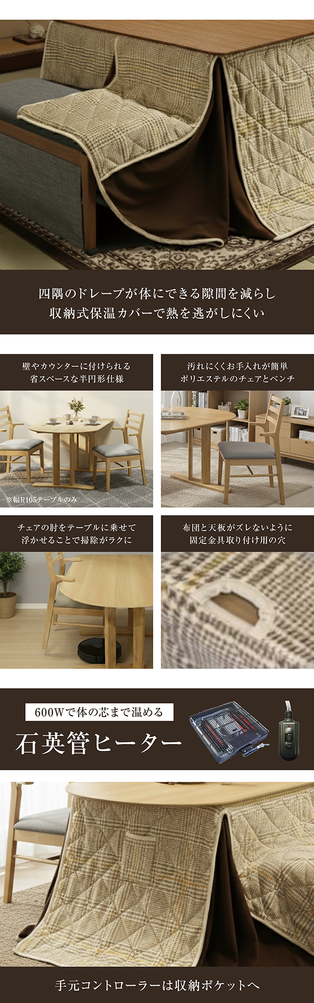 | 特徴 | 【お客様組立て】 ・秋冬はダイニングこたつ、春夏はダイニングテーブルとして年中使える ・耐久性が高く、あたたかみがある質感の天然木ラバーウッドを使用 ・四隅のドレープが体にできる隙間を減らし、収納式保温カバーで熱を逃がしにくい ・壁やカウンターに付けられる省スペースな半円形仕様(幅R105テーブルのみ) ・汚れにくくお手入れが簡単なポリエステルのチェアとベンチ ・チェアの肘をテーブルに乗せて浮かせることで掃除が楽に ・布団と天板がズレないように固定金具取付用の穴 ・手元コントローラーは収納ポケットへ |