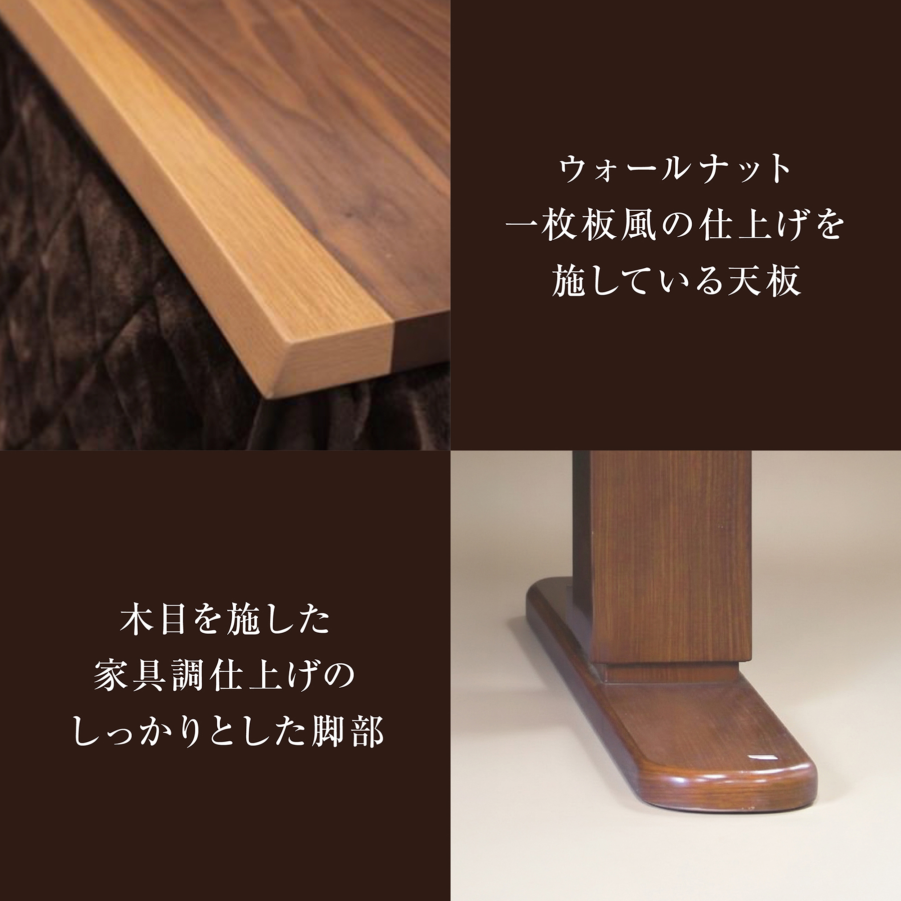 | 特徴 | 【お客様組立て】 ・電動で高さを自由自在に調節でき、一年中快適に過ごせるこたつテーブル ・春夏はダイニングテーブルとして ハイタイプは来客用にもぴったりのサイズ ・秋冬はこたつテーブルに ロータイプは和室にも合います ・高さは最大72cmから47.5cmまでと自由自在 用途に合わせて高さを調節できます ・ウォールナット一枚板風の仕上げを施している天板 ・木目を施した家具調仕上げのしっかりとした脚部 ・手元コントローラーでお好みの高さに簡単に調節できます |