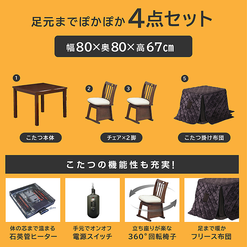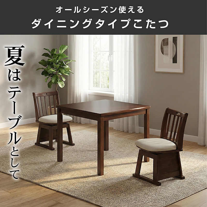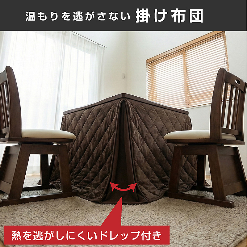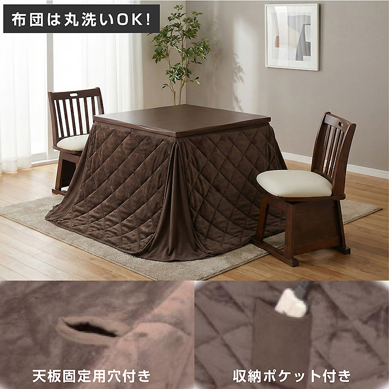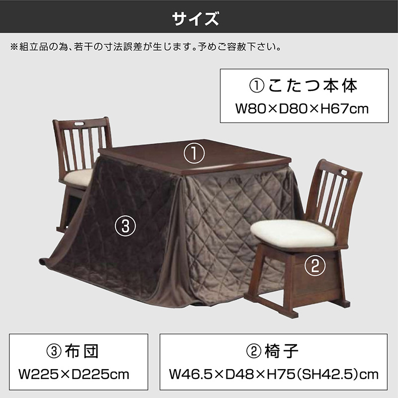 | サイズ(cm) | 【テーブル】W80×D80×H67 【チェア】W46.5×D48×H75(SH42.5) 【こたつ掛け布団】W225×D225cm |