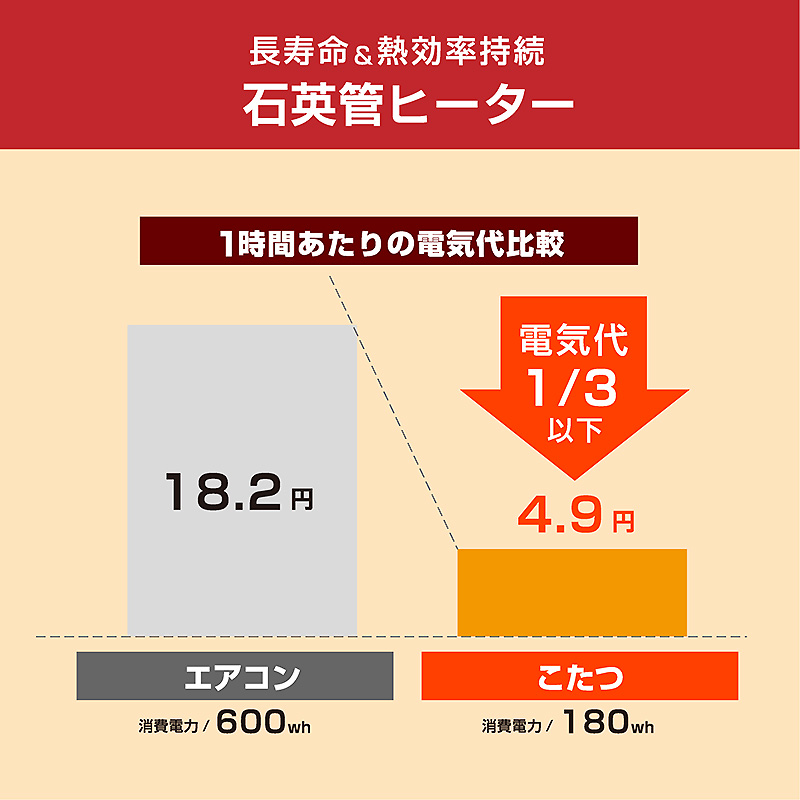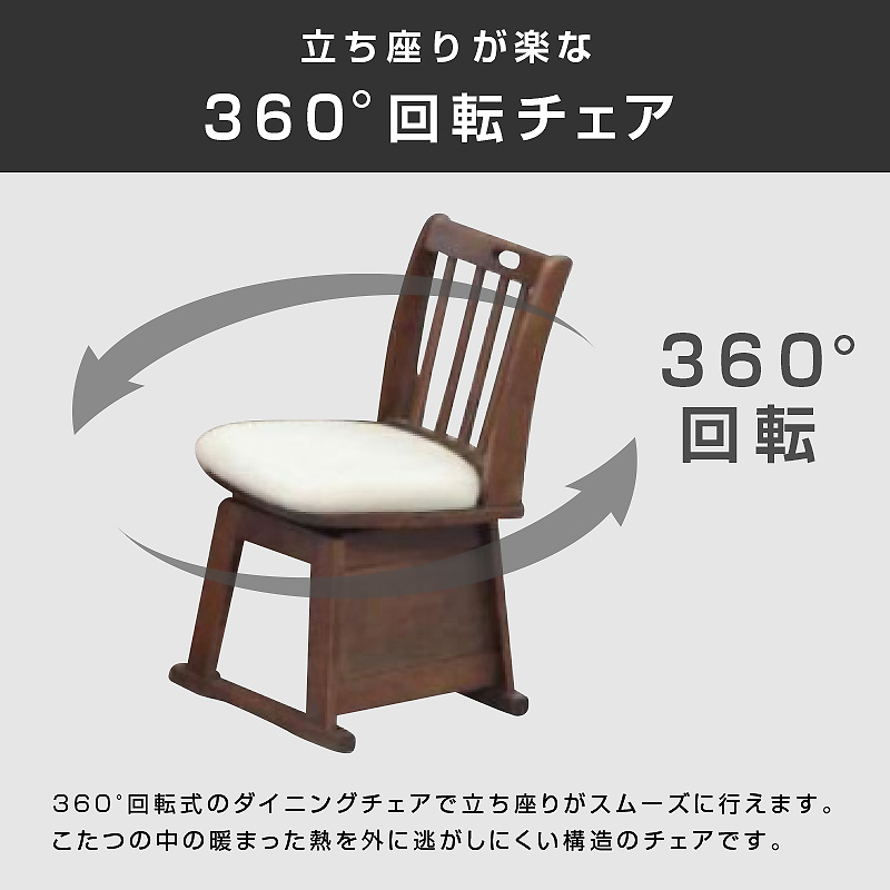 | 特徴 | 【お客様組立て】 ・ハイタイプのダイニングこたつ ・天板は、なぐり加工 ・熱を逃がさないドレップ付き掛け布団 ・天板固定用穴付きと収納ポケット付きの掛け布団 ・立ち上がりが楽な360度回転座椅子 ・椅子は汚してもサッと一拭きできるPVC素材 ・ヒーターは石英管ヒーター ・冬はこたつ、夏はリビングテーブルとしてオールシーズンお使いいただけます。 ・手元スイッチでオンオフの切り替えが便利 |