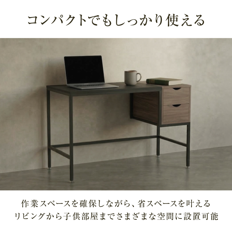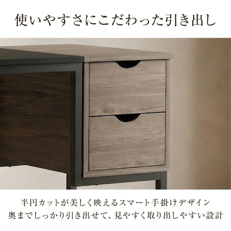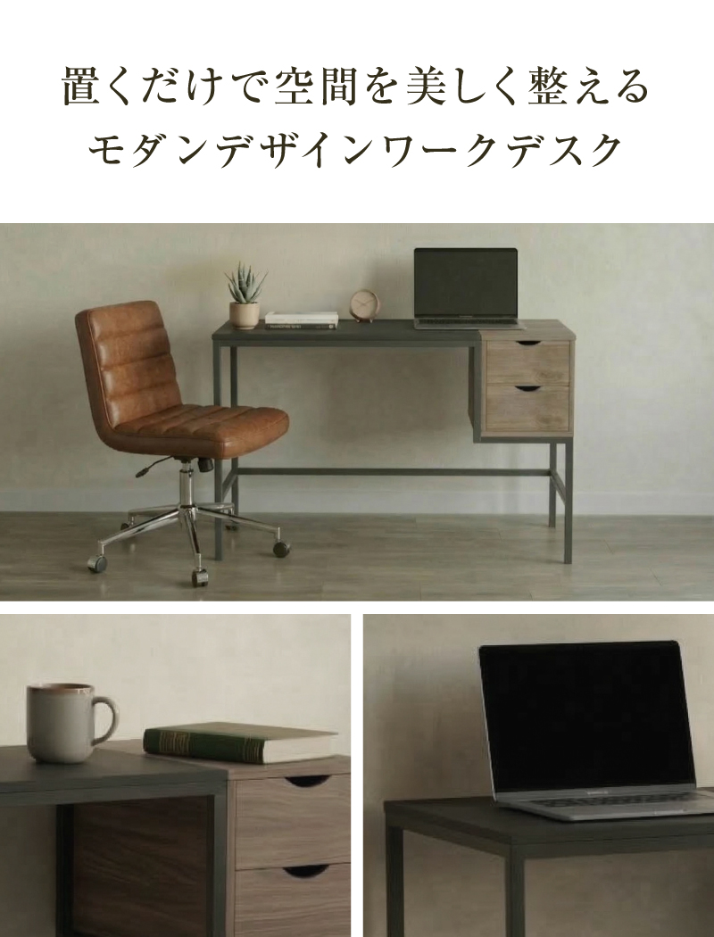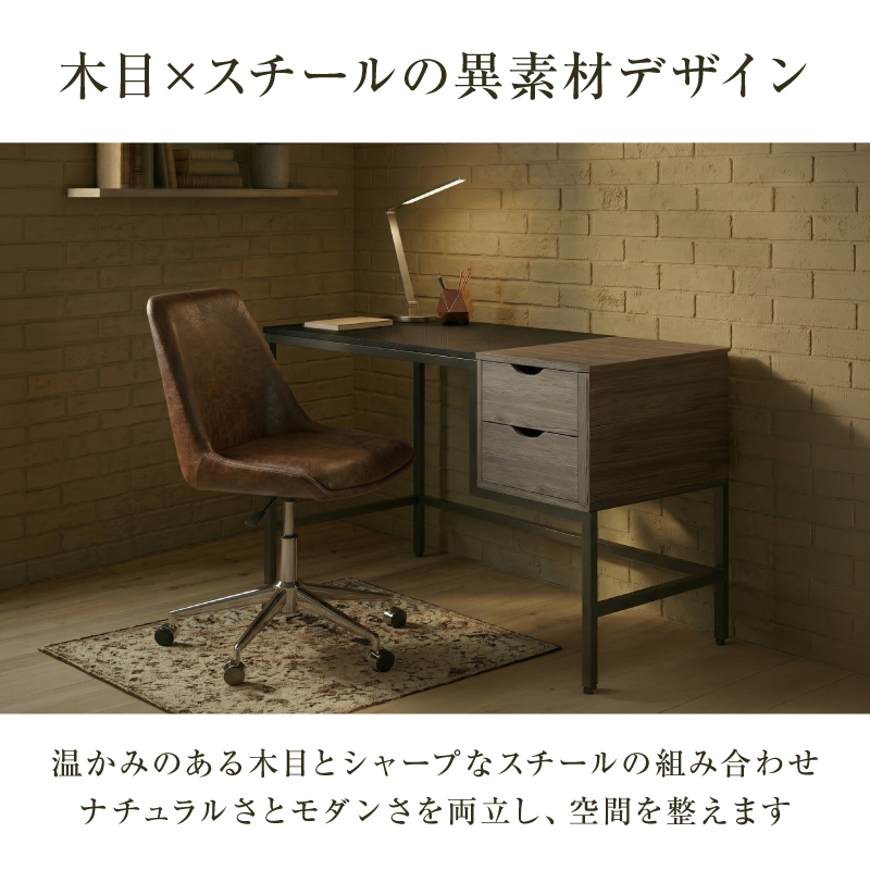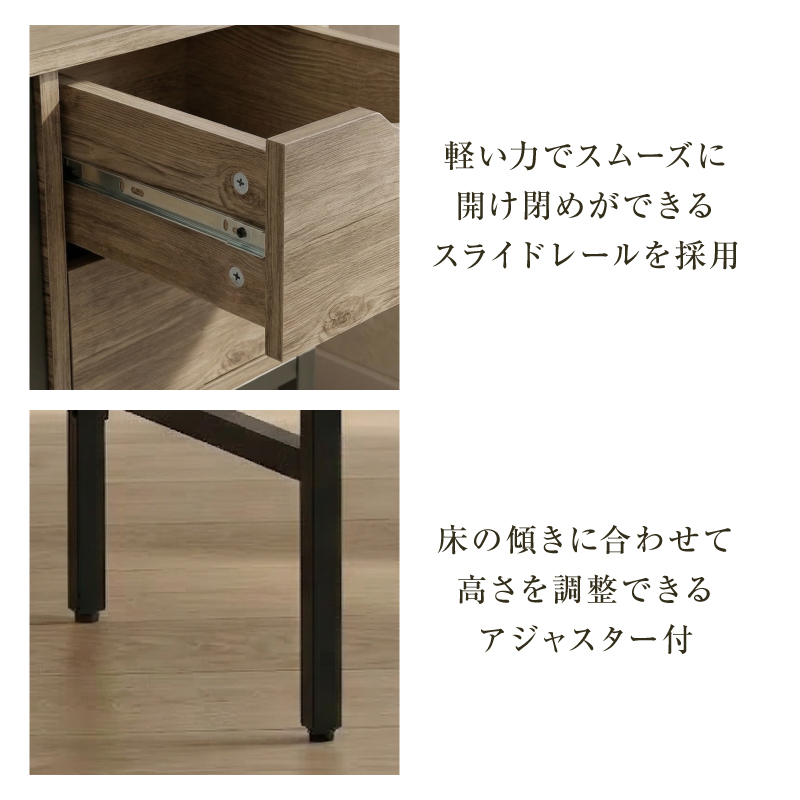| 特徴 | 置くだけで空間を美しく整える モダンデザインワークデスク ・温かみのある木目とシャープなスチールの組み合わせ ・ナチュラルさとモダンさを両立し、空間を整えます ・作業スペースを確保しながら、省スペースをかなえる ・リビングから子供部屋までさまざまな空間に設置可能 ・半円カットが美しく映えるスマート手掛けデザイン ・置くまでしっかり引き出せて、見やすい設計 ・軽い力でスムーズに開け閉めができるスライドレールを採用 ・床の傾きに合わせて高さを調整できるアジャスター付 |