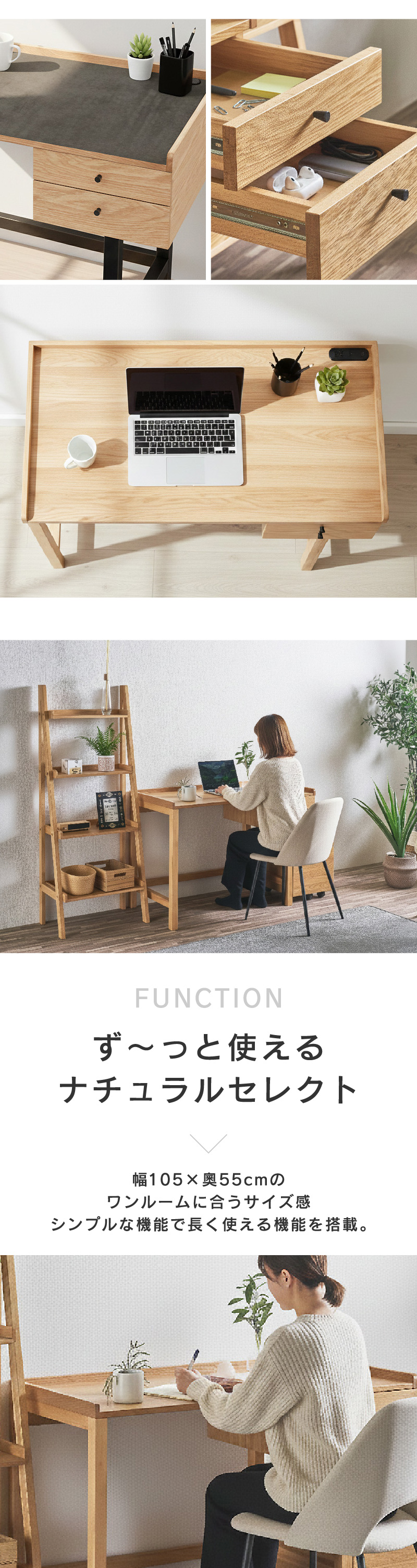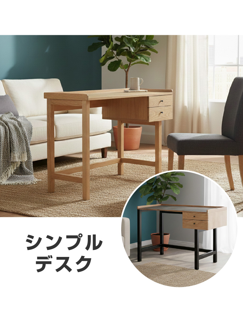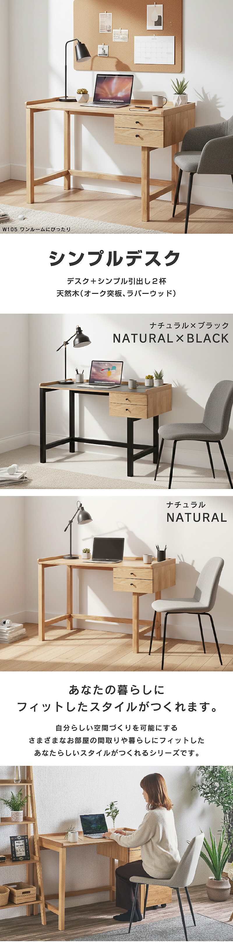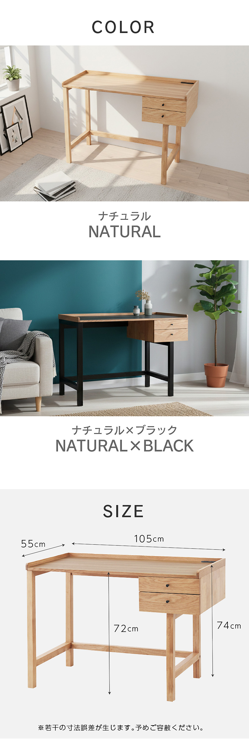 カラー ナチュラル ナチュラル・ブラック 生産国 ベトナム サイズ 幅105×奥行き55×高さ74cm(天板高72cm) 材質 NAは天然木(オーク突板、ラバーウッド) ※NA-BKは天板メラミン 特徴 ・天然木のぬくもりを感じる、シンプルで上質なデスク ・オーク突板の美しい木目と、ラバーウッドの安定感ある脚部が、ワークスペースをやさしく、そしてスマートに整えます ・幅105cmの程よいサイズ感は、在宅ワーク・学習机・趣味の作業台としても使いやすい ・天板奥にはコンセントを内蔵。 PC・スマートフォン・デスクライトなどをその場で給電でき、配線もすっきり ・天板の周囲には立ち上がり(縁)付き。ペンや小物が転がり落ちにくく、見た目にもデザインのアクセントになります ・軽い力でスムーズに開け閉めができるスライドレールを採用 送料 送料無料 ただし、北海道・東北地域は追加送料が必要となります。(沖縄・離島は別途お見積り) また、開梱設置サービスをご利用の場合、送料とは別に料金が必要です。ご注文前にお問い合せください。 追加料金が必要な場合、買い物カゴでは再計算されません。料金確定後、こちらからご連絡させていただきます。