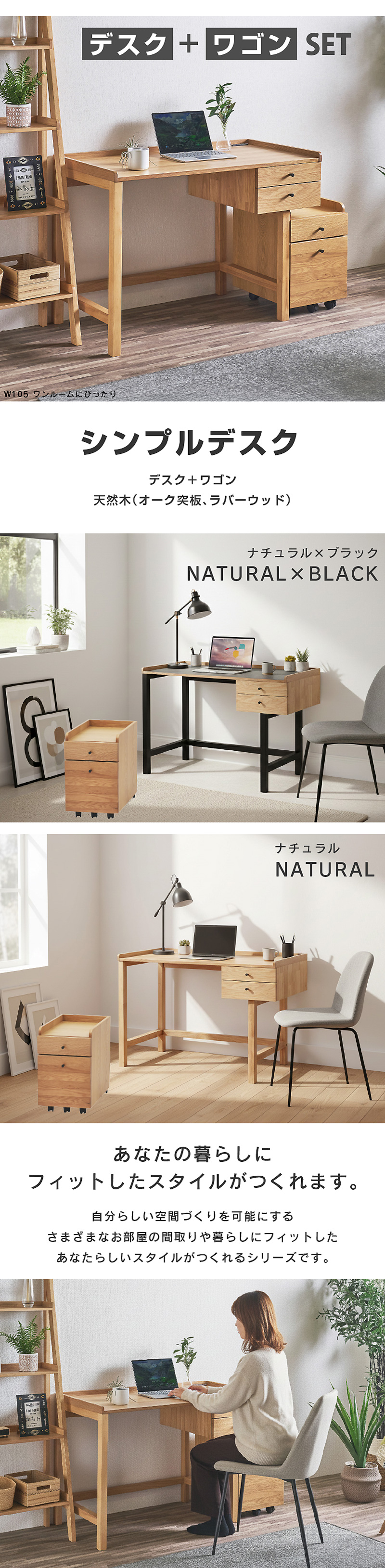 | カラー | デスク本体:ナチュラル/ワゴン:ナチュラル デスク本体:ナチュラル・ブラック/ワゴン:ナチュラル |