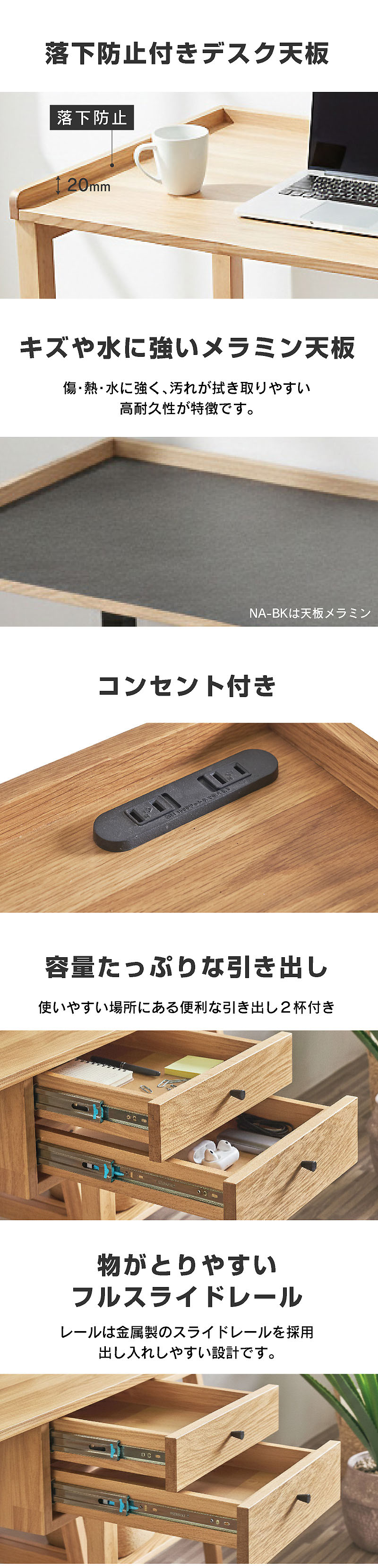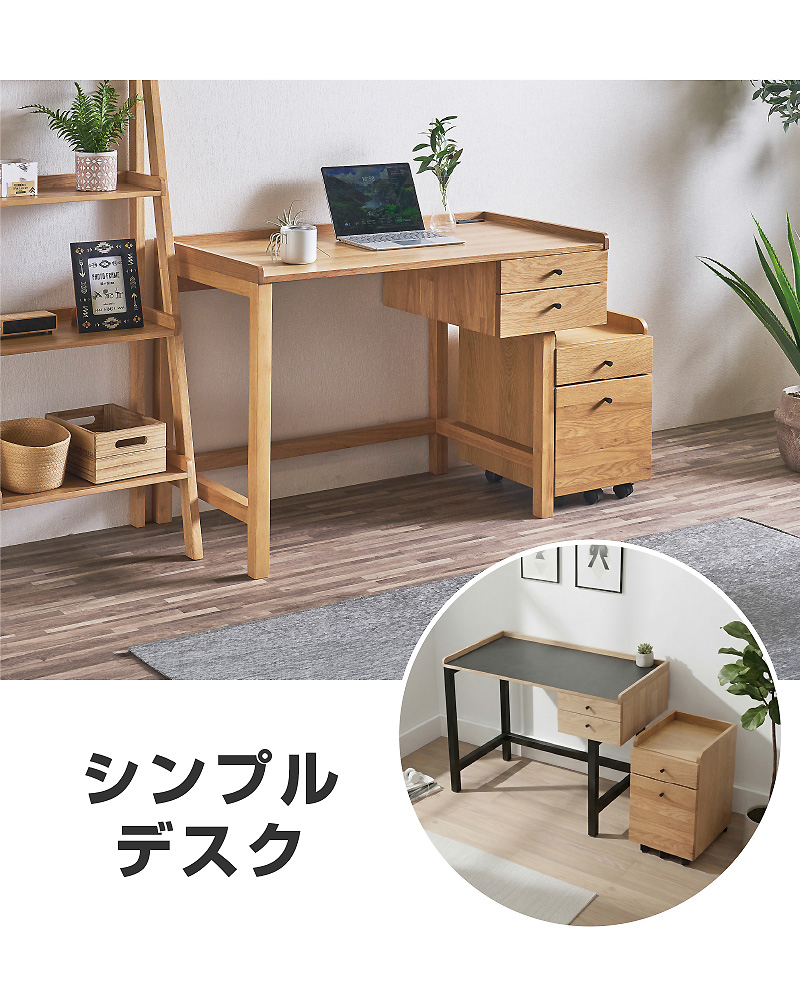 | 材質 | デスク:NAは天然木(オーク突板、ラバーウッド) デスク:※NA-BKは天板メラミン ワゴン:オーク突板 |