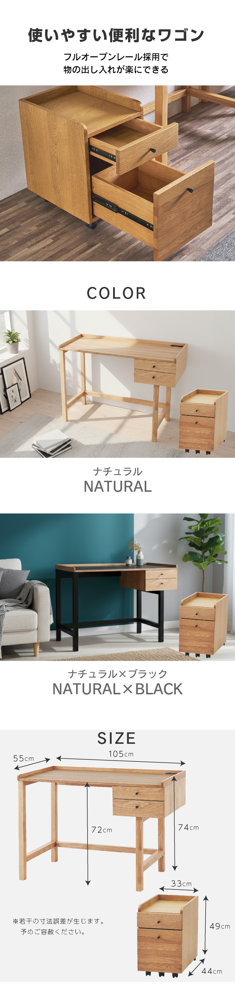 | サイズ | デスク本体:幅105×奥行き55×高さ74cm(天板高72cm) ワゴン:幅33×奥行き44×高さ49cm |