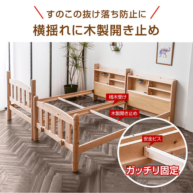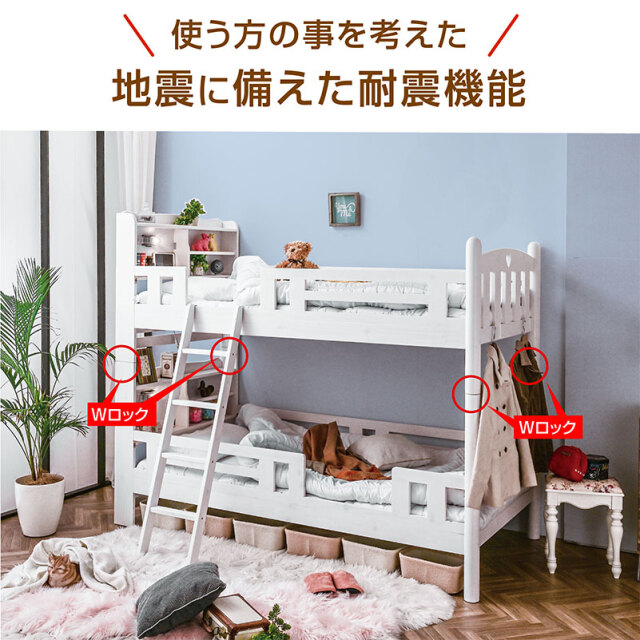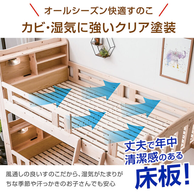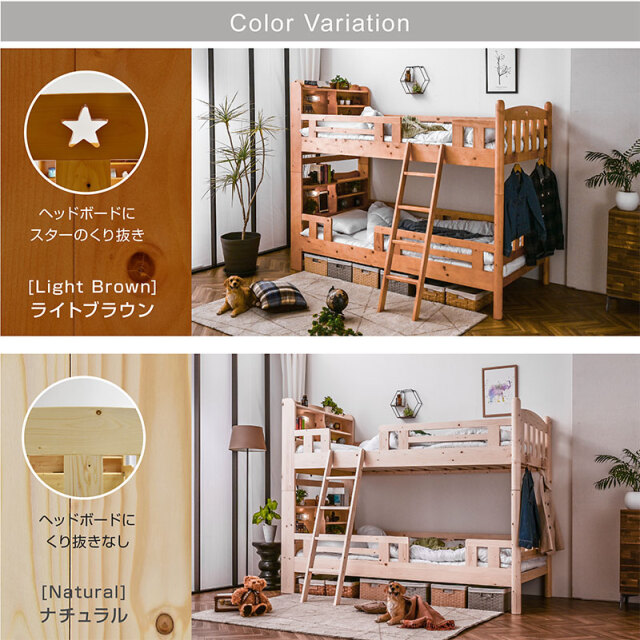 頑丈で安心して使える木製二段ベッド。ナチュラル・ライトブラウン・ホワイトの3色展開で、お部屋に合わせて選べます。宮棚にはLED照明と2口コンセントを備え、読書やスマホ充電にも便利。通気性の良いすのこ構造でオールシーズン快適に使用でき、天然木のあたたかみがやさしく空間を彩ります。分割してシングルベッドとしても利用可能で、成長やライフスタイルの変化にも対応。家族みんなに長く寄り添うファインシリーズです。