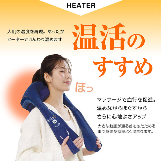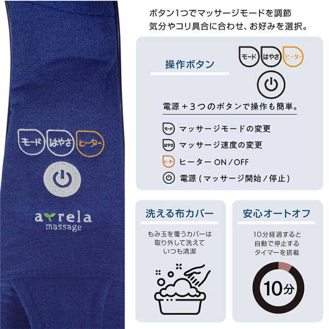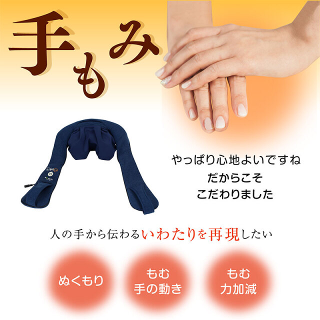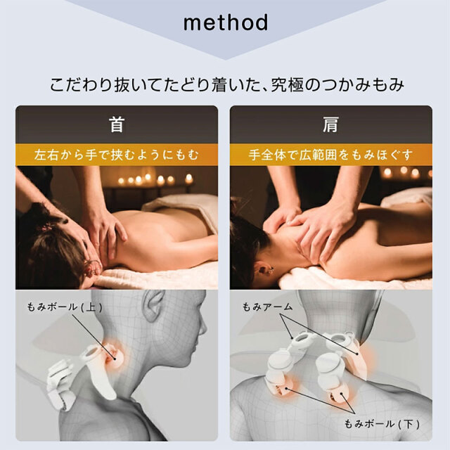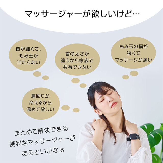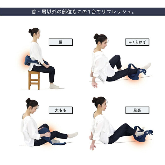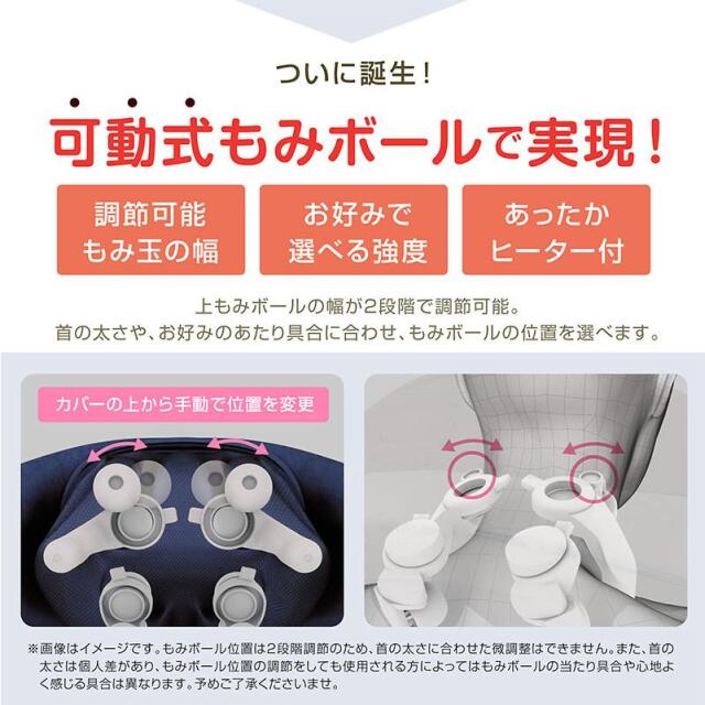 | 特徴 | ・可動式もみボールを搭載しフィット感を調節可能な首マッサージャー ・首だけでなく腰、太もも、ふくらはぎ、足裏のマッサージも可能 ・もみボールに加えもみアームを搭載しているので、まるで手もみのようなマッサージ感 ・3種類のマッサージモードを内蔵。気分やコリに合わせて使い分けできます ・充電式でコードレスなので持ち運び可能。オートオフ機能(10分) ・使いやすいシンプルな手元コントローラー ・ヒーター機能搭載。温めながらほぐします ・布カバーは洗濯可能いつでも清潔に使えます。 |