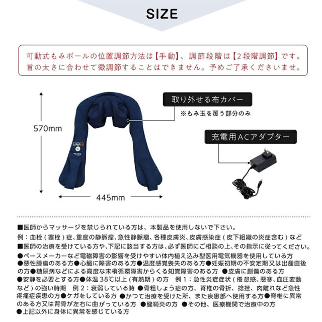 【サイズ】 本体サイズ:幅44.5×奥行57×高さ21(cm) 梱包サイズ:幅35×奥行20.5×高さ26.5(cm) 【重さ】 製品重量:約1.95kg(ACアダプター含む) 【定格時間】 10分 【定格消費電力】 14W 【1ヶ月の電気代】 約2円(目安) 【医療機器認証番号 】 303AHBZX00002000 【材質】 本体:ウレタン、布カバー:ABS 【特徴】 ・可動式もみボールを搭載しフィット感を調節可能な首マッサージャー ・首だけでなく腰、太もも、ふくらはぎ 足裏のマッサージ可能 ・もみボールに加えもみアームを搭載 まるで手もみのようなマッサージ感 ・3種類のマッサージモード 気分やコリに合わせて使い分け ・充電式 コードレスで持ち運び可能。オートオフ機能(10分) ・使いやすいシンプルな手元コントローラー ・ヒーター機能搭載 温めながらほぐします ・布カバーは洗濯可能いつでも清潔 【送料】送料無料 ただし、北海道・東北地方・沖縄は追加送料が必要。(離島は別途お見積り) ※追加料金が必要な場合、買い物カゴでは再計算されません。料金確定後こちらから連絡いたします。 【注意】お使いのモニターや照明器具等で実際の色とは若干異なって見える場合もございます。