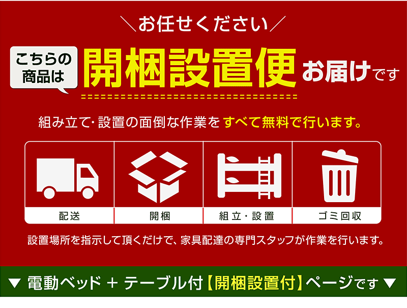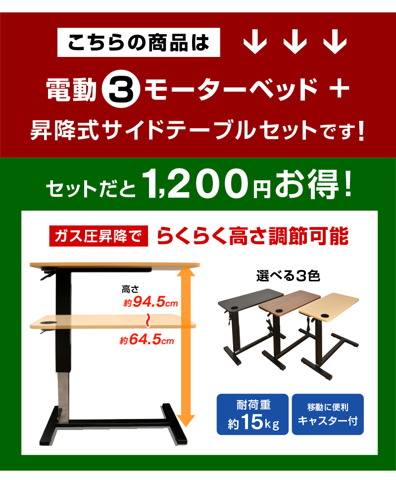 | セット内容 | 4点セット(ベッド本体、専用マットレス、コントローラー、左右の手すり)+昇降式テーブル |