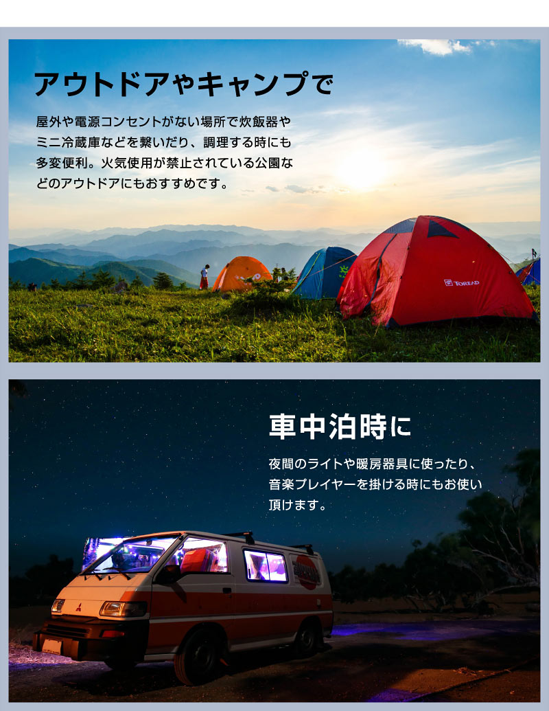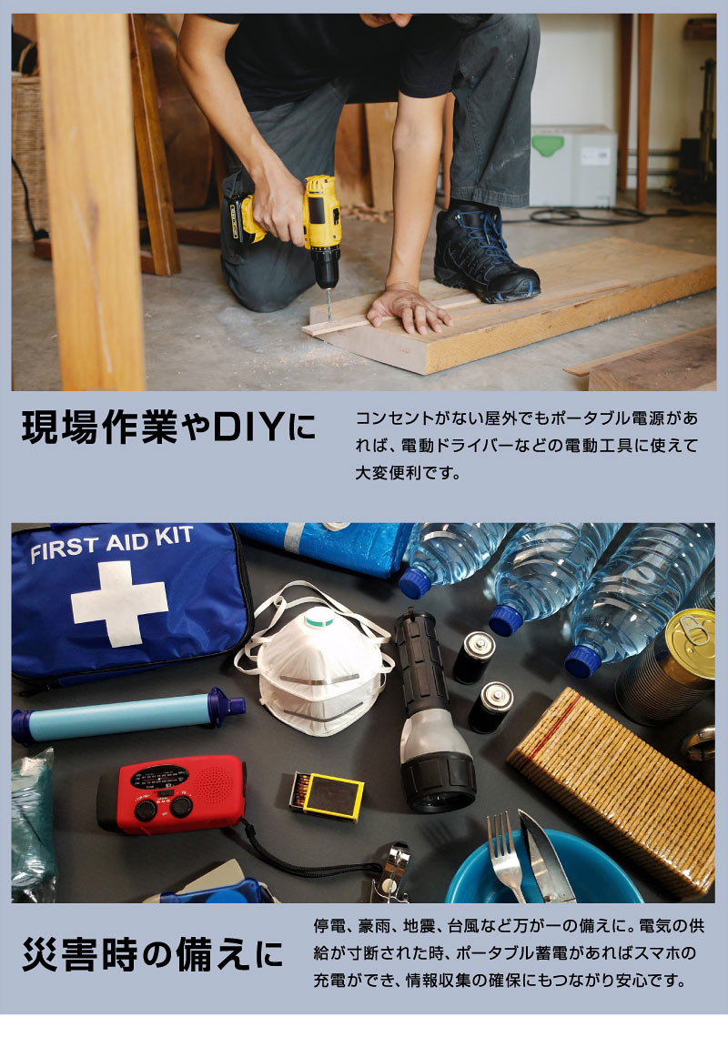 | 特徴 | ・万が一の緊急電源供給に最適 ・キャンプやアウトドア、車中泊の必需品 ・屋外でのDIYや現場作業にも使えて便利 ・電源出力容量1000W:消費電力が1000Wまでの製品をご使用いただけます ・付属品:取り扱い説明書、ACアダプター、電源コード、車載用充電ケーブル ・スマートフォン充電回数(3000mAh):約100回 ・シガー出力 12V 10A ・業界トップクラスの軽量ボディ ・6種類の出力ポートと3種類の充電ポート付 |