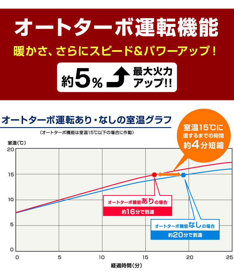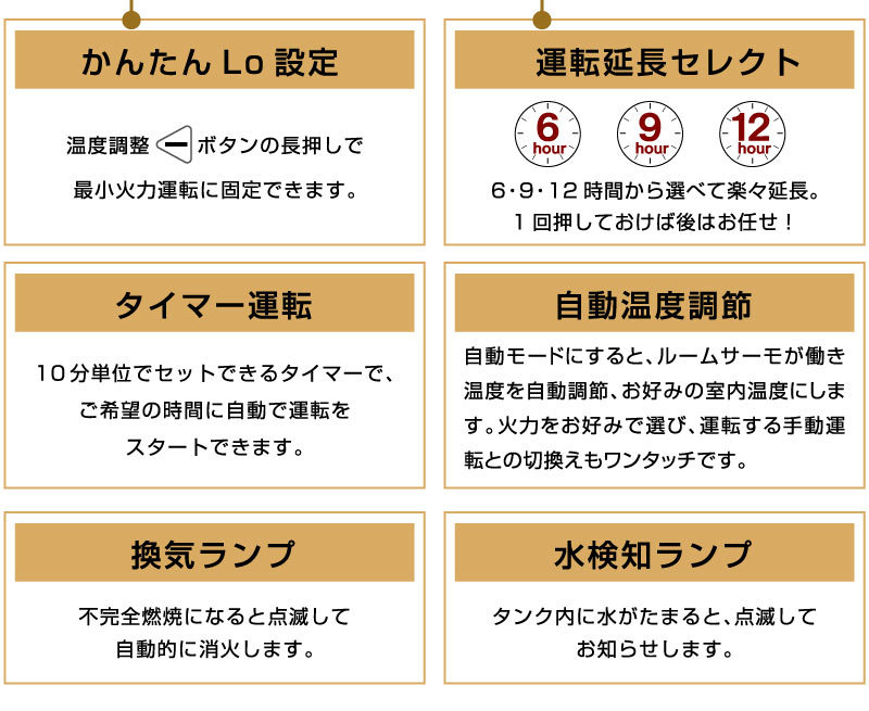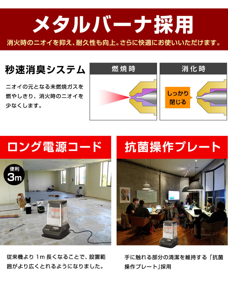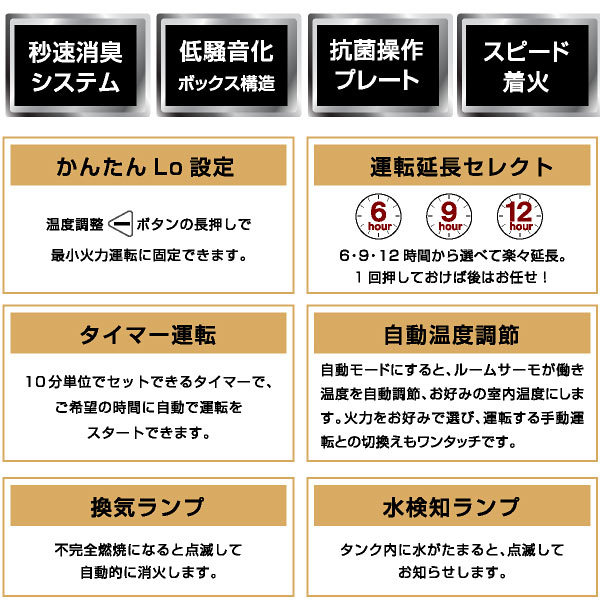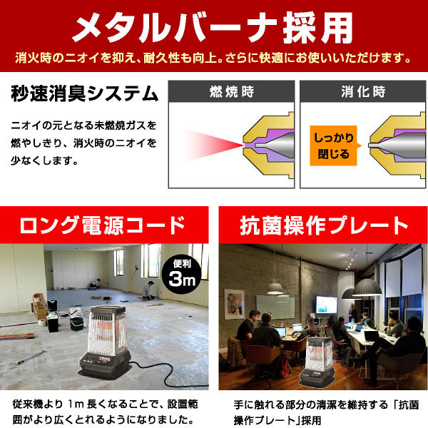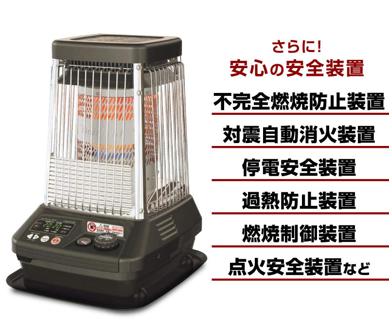 | 特徴 | ・温風&放射の2ウェイ暖房+オートターボ運転で、すばやく暖め ・秒速消臭システムで未燃焼ガスを燃やしきり、消火時のニオイを軽減 ・オートターボ運転で最大火力がアップ! ・わずか80秒のスピード着火とパワフル暖房 ・大型の放熱器で放射効率もよくハイパワーな暖かさを実現 ・設定温度が選べる自動モードと火力を選択できる手動モードの切り替えが可能 ・ご使用時間に合わせて6時間/9時間/12時間から選べ、運転延長機能で消し忘れを防止 ・3mロング電源コード!延長コード無しで設置できる場所の範囲が広がります ・熱くならない天板 ・いろんな人が触れるからいつでも清潔な抗菌操作プレート ・10分単位でセットできるタイマー付きで、ご希望の時間に自動で運転をスタート ・メタルバーナ採用で消火時のニオイを抑え、耐久性も向上 ・音を包み込むボックス構造採用 最大燃焼時も50dBの運転音で低音 ・停電安全装置、耐震自動消火装置、燃焼制御装置、点火安全装置、不完全燃焼防止装置、過熱防止装置 ・室温異常高温防止装置、水検知装置、消し忘れ防止装置 ※こちらの商品は配送先が企業様のみとなっております |