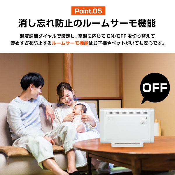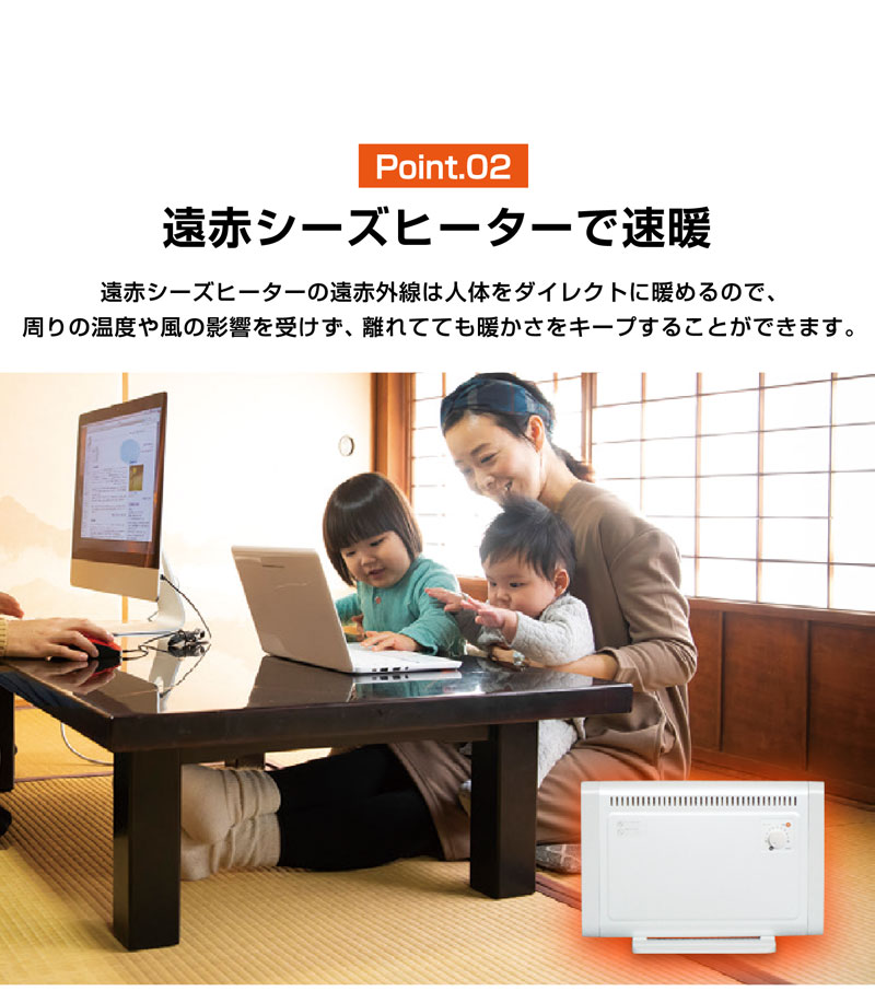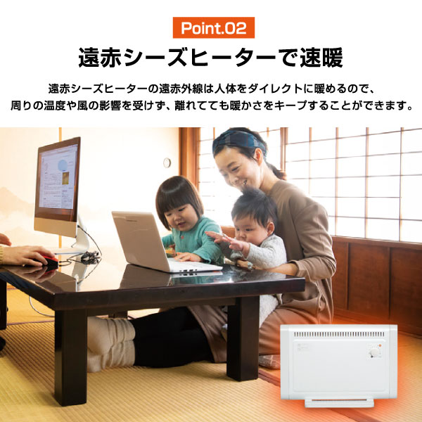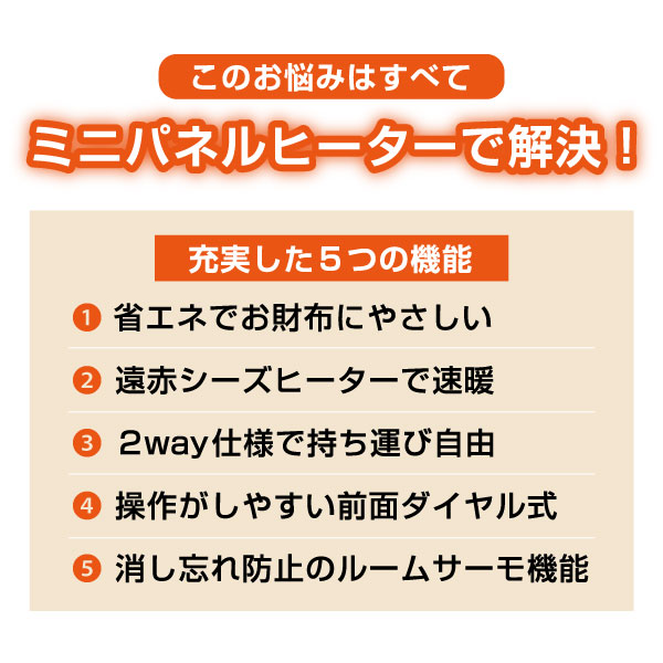 | 特徴 | ・省エネでお財布にやさしい ・遠赤シーズヒーターで速暖 ・2way仕様で持ち運び自由 ・操作がしやすいダイヤル式 ・消し忘れ防止のルームサーモ機能 |