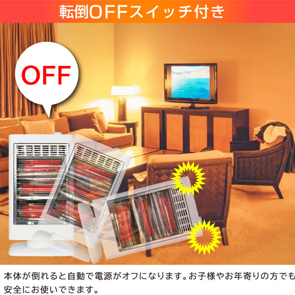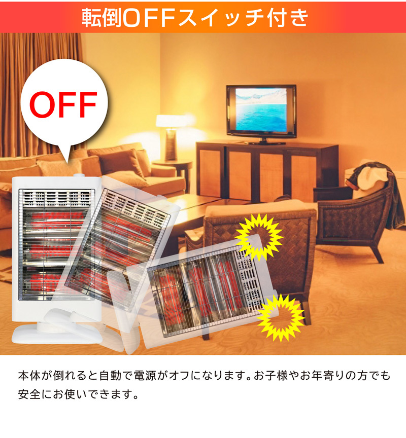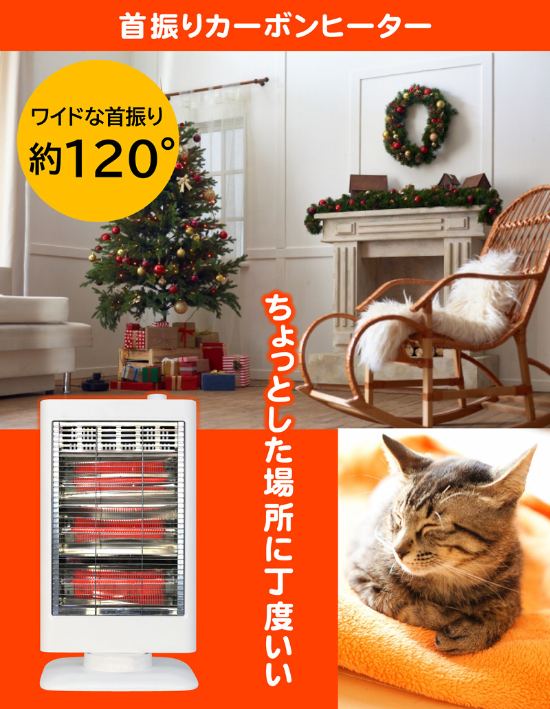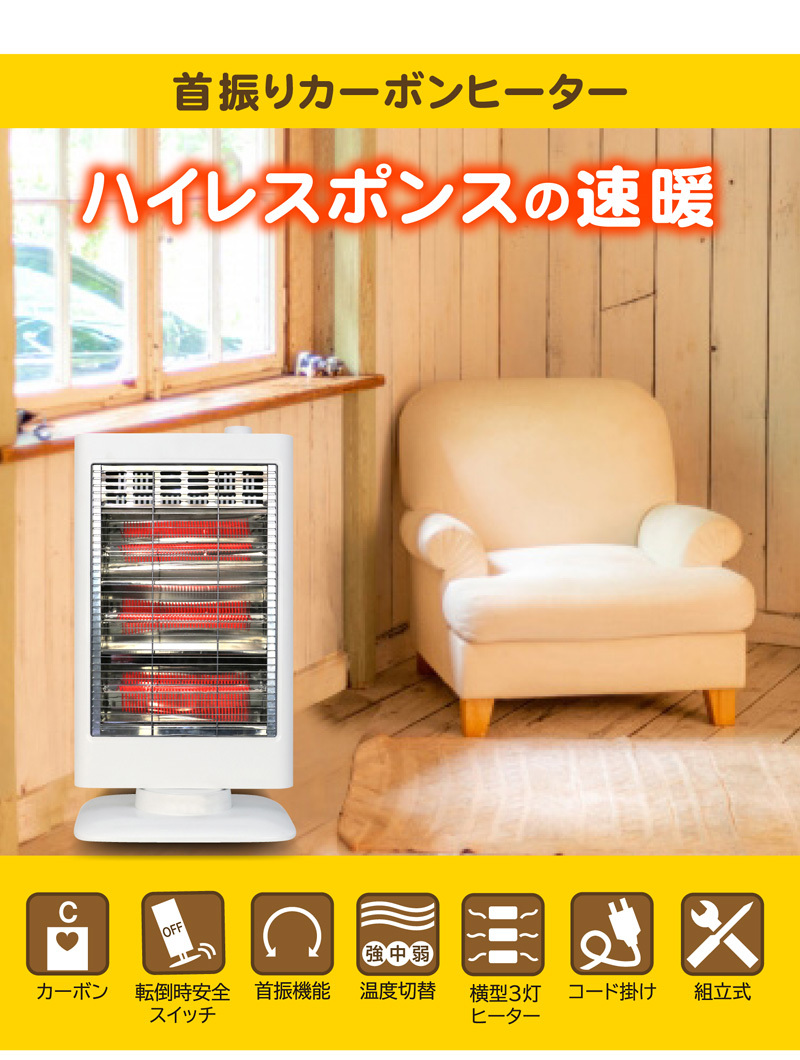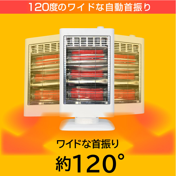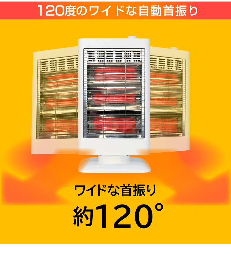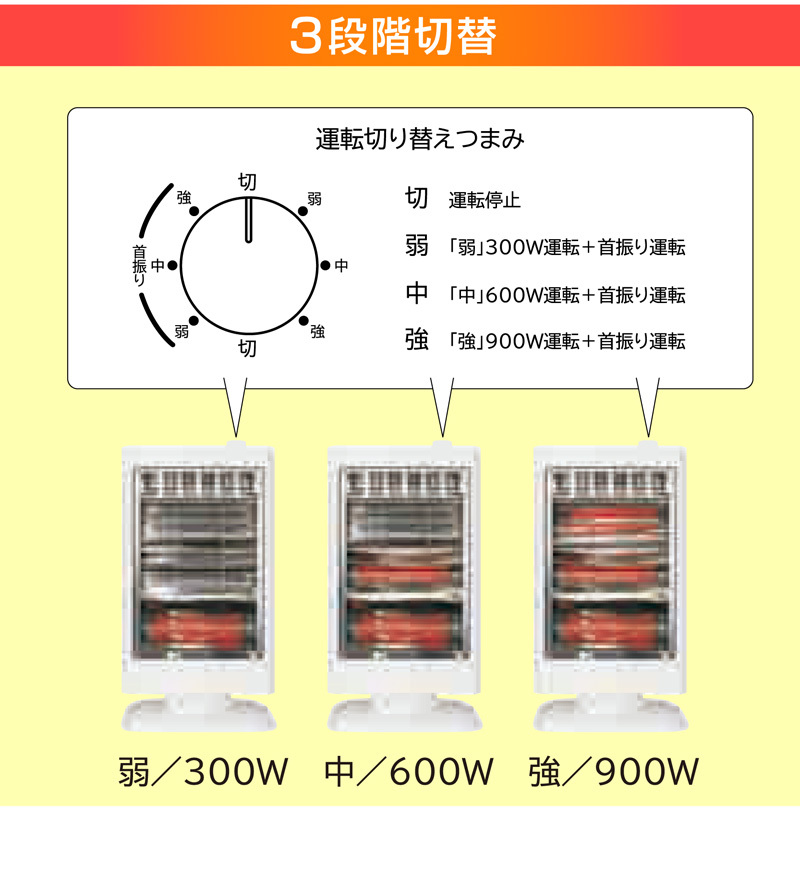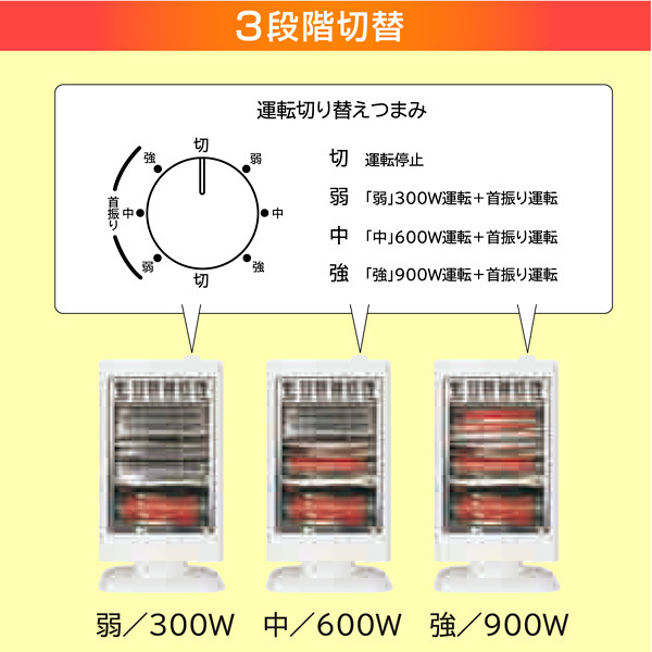 | 特徴 | ・弱300W・中600W・強900Wの出力切替 ・操作が簡単なロータリースイッチ ・左右約120度のワイドな自動首振り ・転倒OFFスイッチ付 ・コード長さ約1.7m |