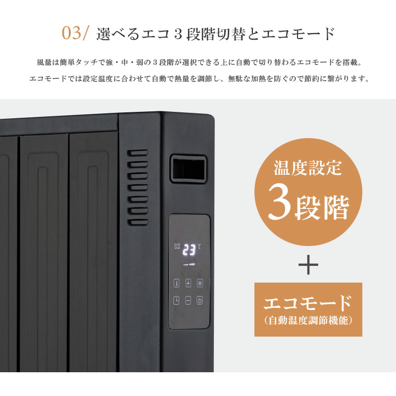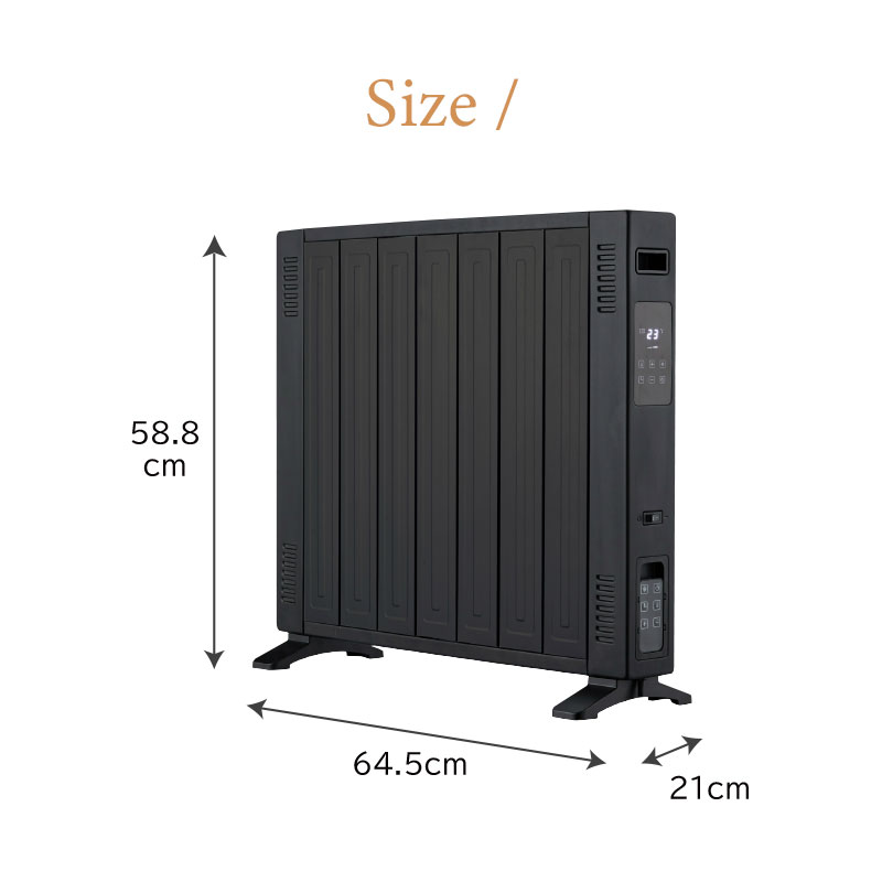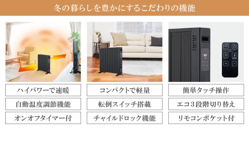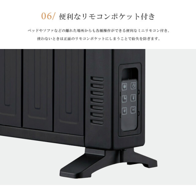 | 特徴 | ・自然対流熱と輻射熱で臭いがなく、風もなく、静かなハイパワー暖房 ・コンパクトで軽量 ・選べるエコ3段階切替とエコモード搭載 ・24時間オフタイマー付き ・チャイルドロックと転倒スイッチ搭載 ・便利なリモコンポケット付き |