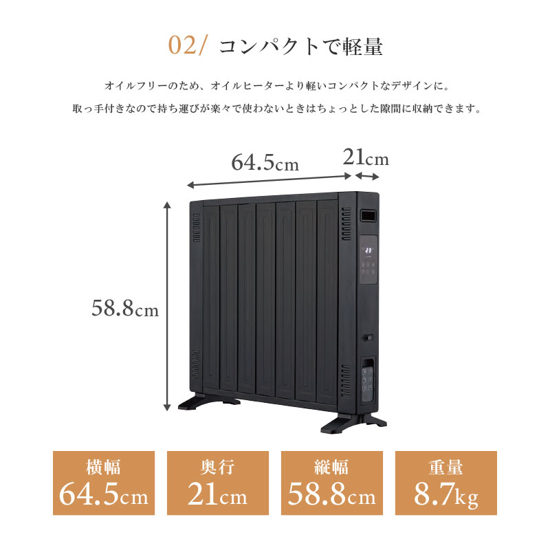 【商品について】 オイルレスヒーター(コンベンションヒーター) ■製品寸法 幅64.5×奥行21×高さ58.8(cm) ■製品重量 約8.7kg ■カラー ブラック ■消費電力 1200W ■電源 100V 50/60Hz ■電源コード 約1.8m ■安全装置 ・内蔵式転倒スイッチ ・24時間OFFタイマー ・チャイルドロック 【ご注意】 ※メーカー在庫が無くなり次第、後継機への移行となり、型番や色味が異なる場合がございます。 【送料について】 ・送料無料 ただし、東北・北海道・沖縄・離島へのお届けにつきましては送料無料対象の場合も追加送料が必要となります。 また、開梱設置サービスをご利用の場合、送料とは別に料金が必要です。ご注文前にお問い合せください。 追加料金が必要な場合、買い物カゴでは再計算されません。料金確定後、こちらからご連絡させていただきます。