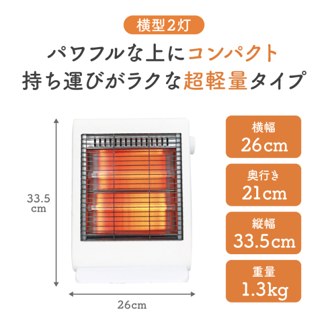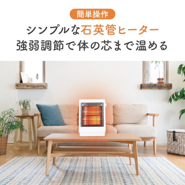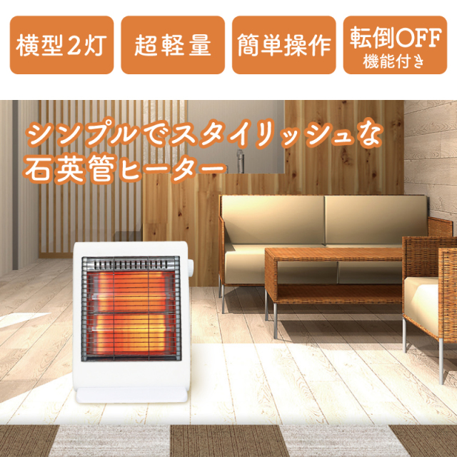 | 特徴 | ・シンプルでスタイリッシュな石英管ヒーター ・パワフルな上にコンパクトで持ち運びが楽な超軽量タイプ ・シンプルな石英管ヒーターは強弱調節で体の芯まで温める ・転倒時に自動でOFFになり、お子さまやペットがいても安心 ・コード掛けあり、組み立て式 |