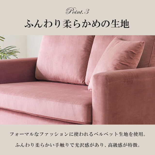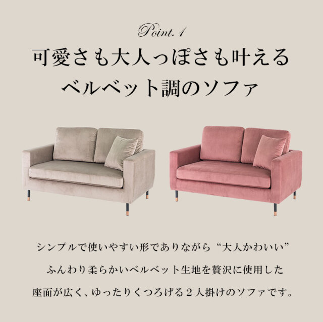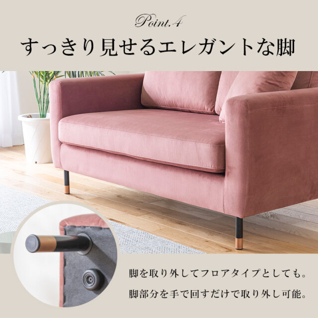 | 特徴 | ・可愛さも大人っぽさも叶えるベルベット調ソファ ・本体と同じベルベット生地のふかふかクッション ・掃除機も入る高さ11cmのやや高めのエレガントな脚 ・ゆったり座れる余裕とほどよいコンパクトサイズ ・ふんわり柔らかめの生地 ・“大人かわいい”2色展開 ・エレガントな脚は取り外し可能でフロアタイプとしても |