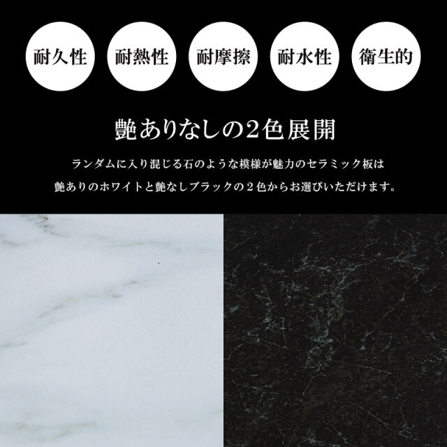 | 材質 | 【天板】セラミック(6mm)、MDF 【脚】スチール(ブラック) |