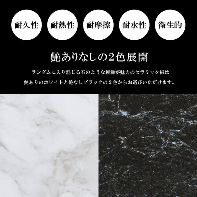 | 特徴 | ・大理石調のセラミック天板と黒のスチール脚がお部屋のアクセントに ・高級感と耐久性に優れたセラミックを贅沢に6ミリ使用 ・艶ありホワイトと艶なしブラックの2色展開 ・アジャスター付きのスチール脚 |
