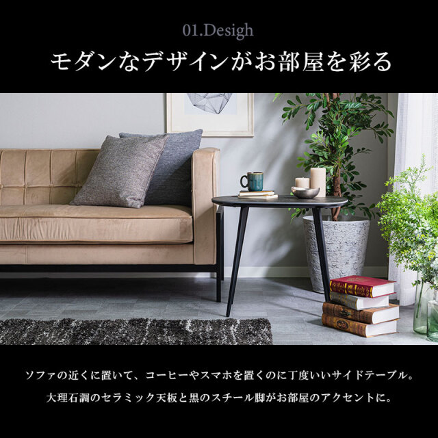 ■サイズ 高さ×幅×奥行(cm)=50×60×45 ■カラー ブラック、ホワイト ■素材 【天板】セラミック(6mm)、MDF 【脚】スチール(ブラック) ※画像にある小物は付属していません。 ※実物に近い状態で撮影していますが、撮影時の光の加減やお客様のPC設定により若干の色合いが異なる場合がございます。 ※曲線部分や若干の個体差により、多少の誤差が生じることがございます。予めご了承ください。 【送料について】 ・送料無料 ただし、東北、北海道、沖縄・離島へのお届けにつきましては送料無料対象の場合も追加送料が必要となります。 また、開梱設置サービスをご利用の場合、送料とは別に料金が必要です。ご注文前にお問い合せください。 追加料金が必要な場合、買い物カゴでは再計算されません。料金確定後、こちらからご連絡させていただきます。 サイドテーブル ベッドサイド 円 丸 大理石 シンプル 60cm 60センチ 玄関 寝室 お手入れ簡単 ハイタイプ モノトーン マーブル調 ブラック ホワイト 黒 白 ストーン 石