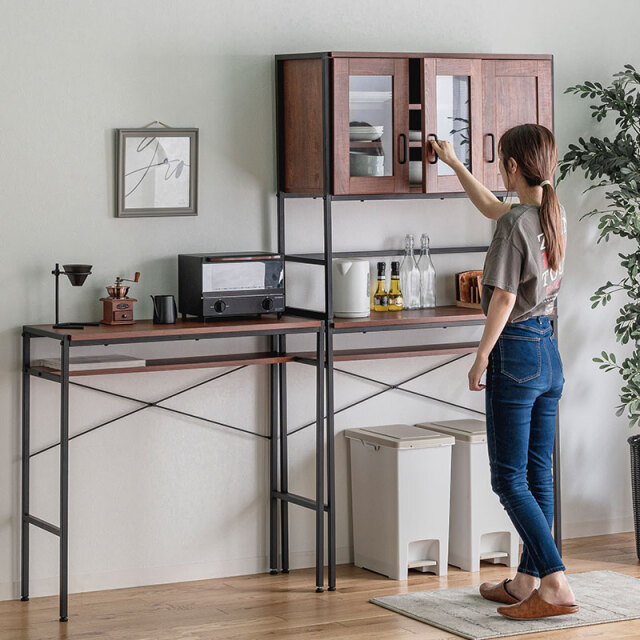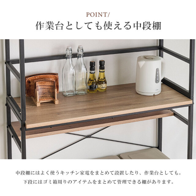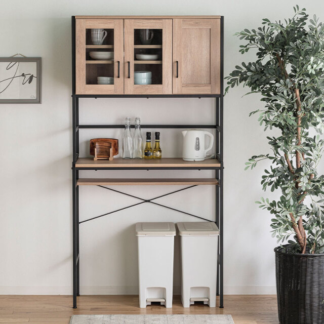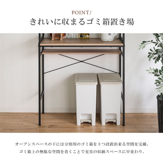 | 特徴 | ・無駄のない北欧風キッチンラック ・きれいに収まるゴミ箱置き場 ・美しいガラスとウッドの扉 ・高さ調節可能な可動式の上段棚 ・作業台としても使える中段棚 ・アジャスター付きのスチール脚 |