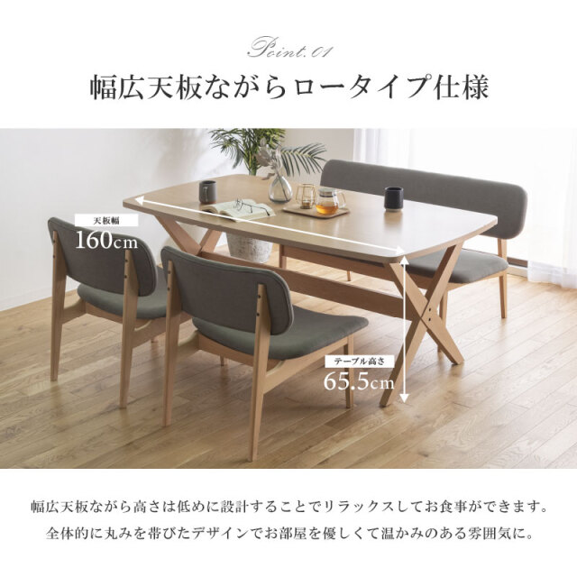 | 特徴 | ・幅広天板ながらロータイプ仕様 ・唯一無二の風合い 天然無垢を使用 ・座面ワイド設計で大人もゆったり ・年中快適なファブリック生地 ・クロスデザイン仕上げの脚部 |