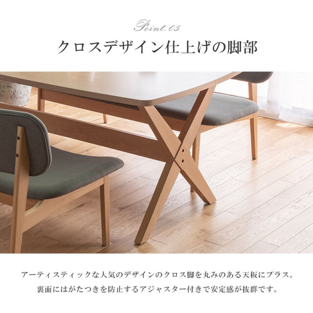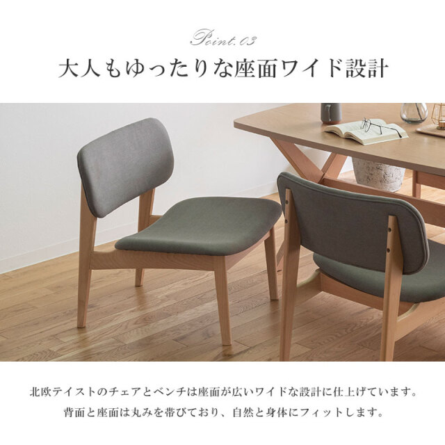 | 材質 | 【ダイニングテーブル】 天板:ビーチ突板 脚部:ラバーウッド無垢 【ダイニングチェア・ベンチ】 ・ラバーウッド無垢 ・ポリエステル100%(張地) |