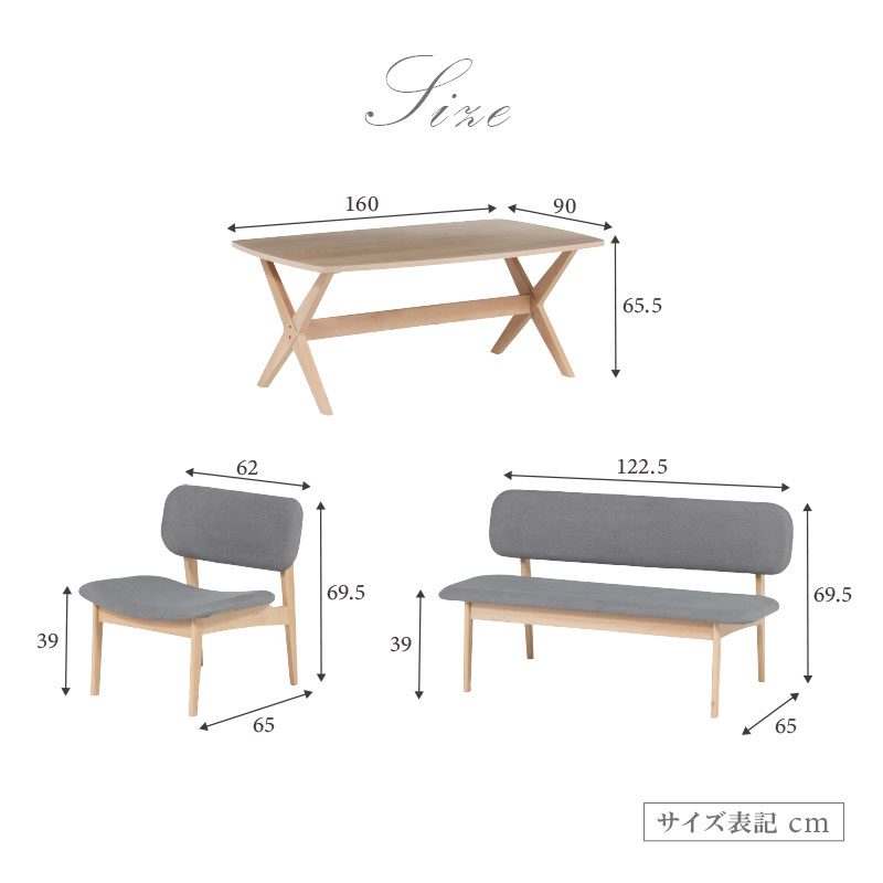 | サイズ(cm) | 【ダイニングテーブル】幅160×高65.5×奥行き90 【ダイニングチェア】幅62×高69.5×奥行き65(座面高39cm) 【ダイニングベンチ】幅122.5×高69.5×奥行き65(座面高39cm) |