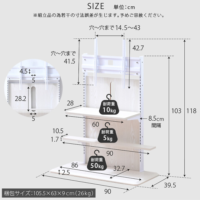 | 梱包サイズ | 幅63×奥行9×高さ105.5cm(重量26kg) |