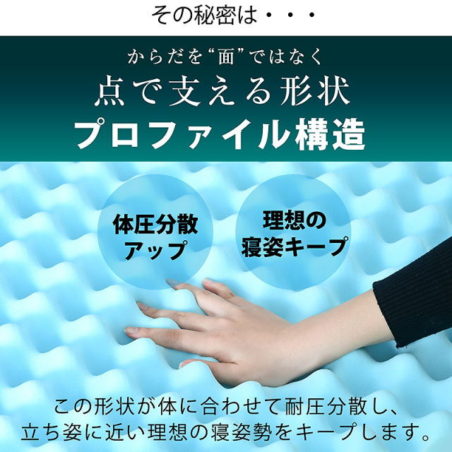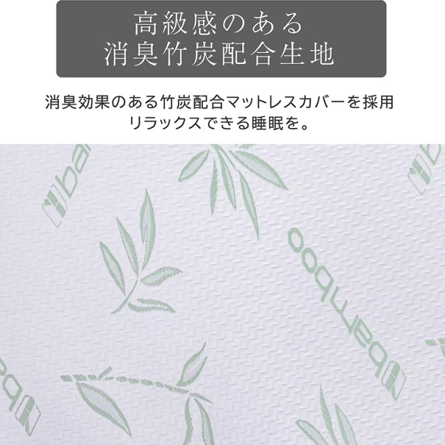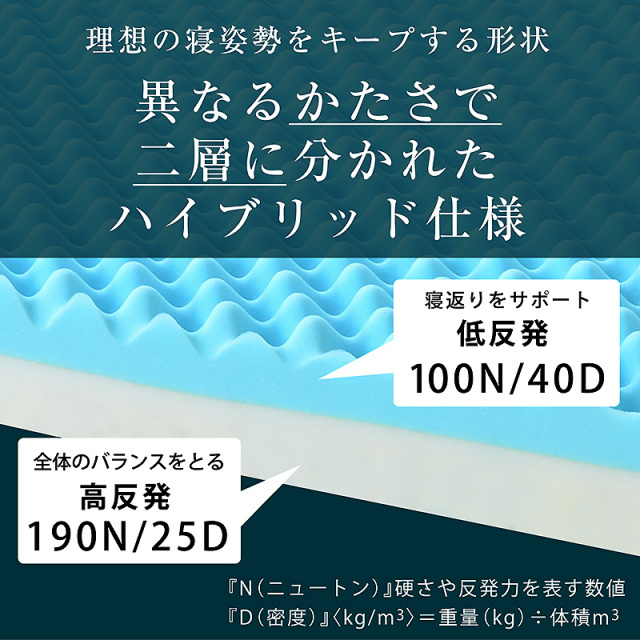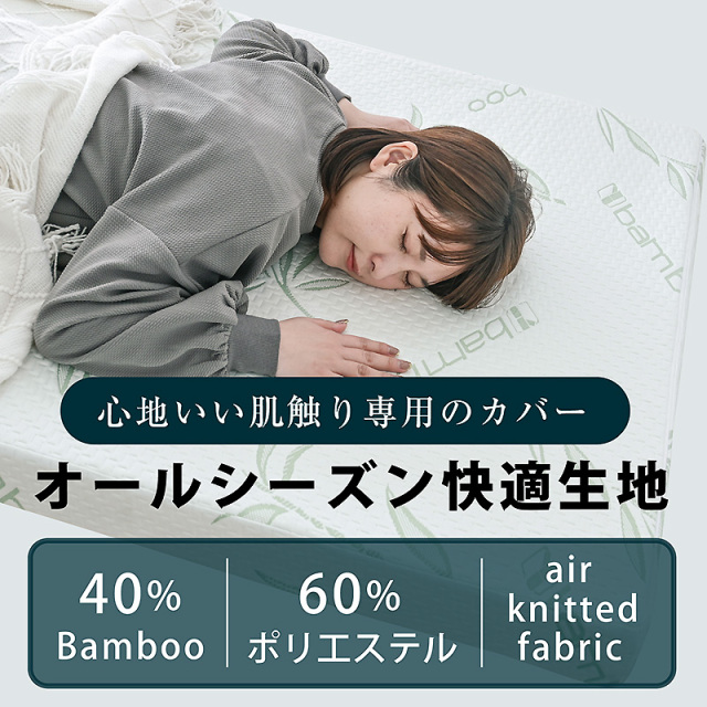 | 材質 | 中材: 【上層/プロファイル面】低反発ウレタンフォーム(40D、100N) 【下層】高反発ウレタンフォーム(25D、190N) 外カバー:40%Bamboo,60%ポリ工ステル air knitted fabric 内力バ-:100% ポリエステル |