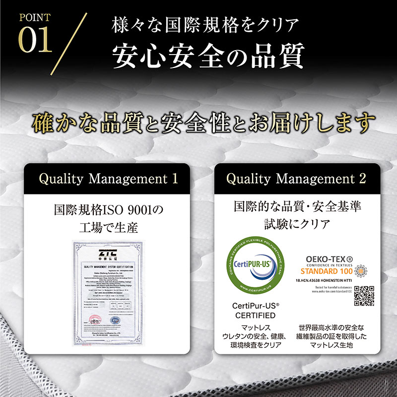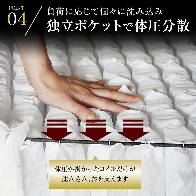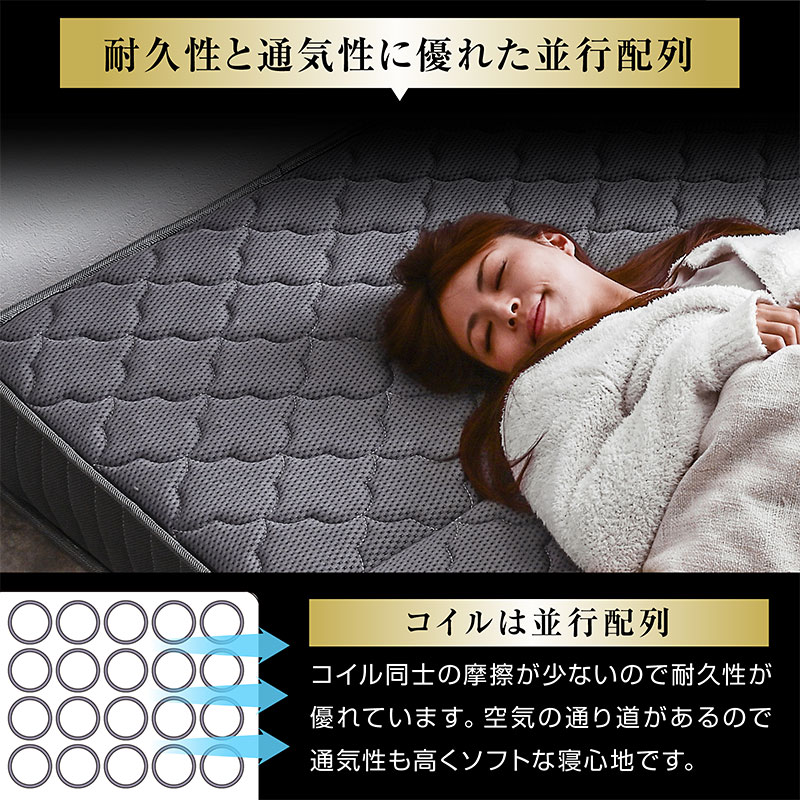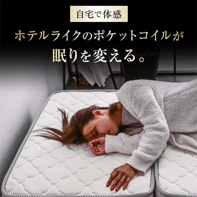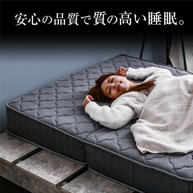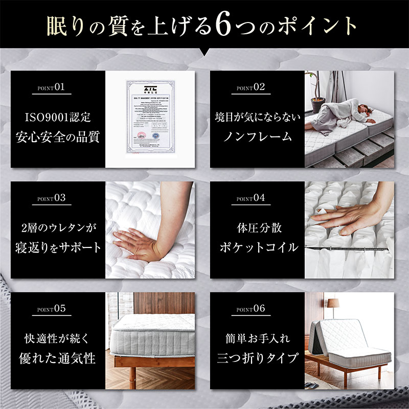 | 特徴 | 【輸入品】 ・身体を点で支え、体圧分散に優れた三つ折りポケットコイルマットレス ・理想的な寝姿勢を作る、快適な寝心地 ・耐久性、通気性に優れた並行配列コイル ・ISO9001認定工場で生産した安心の品質 ・マットレスのフレーム部分を取り外し継ぎ目が気にならない寝心地 ・反発力や強度に優れたコイルスプリングを採用 ・マットレス全体の通気性・耐久性にこだわり |