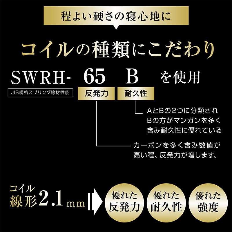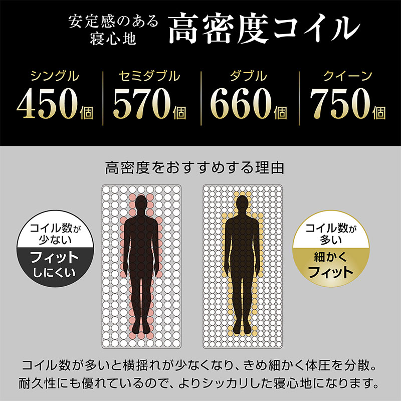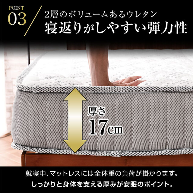 | サイズ(cm) | シングルサイズ:幅97×奥行195×高さ17 セミダブルサイズ:幅120×奥行195×高さ17 ダブルサイズ:幅140×奥行195×高さ17 クイーンサイズ:幅160×奥行195×高さ17 |