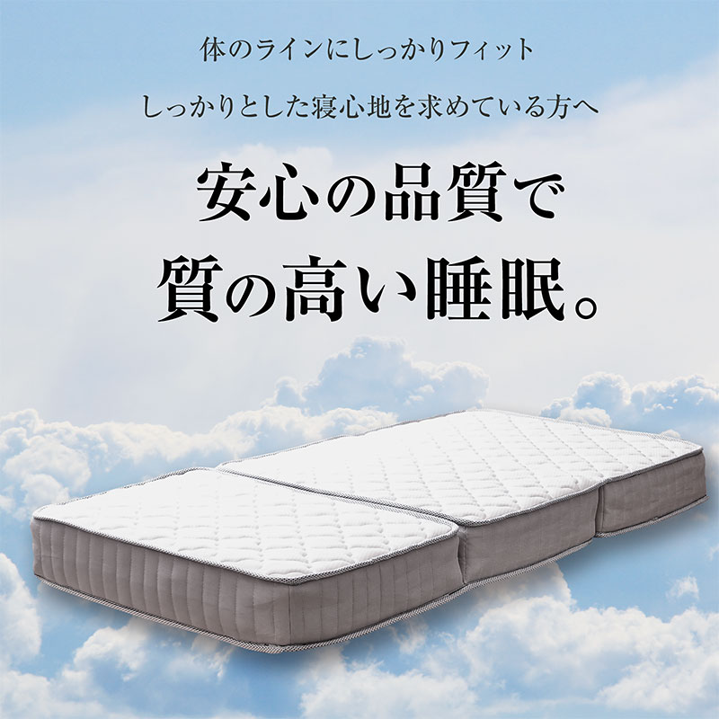 三つ折りポケットコイルマットレスは、身体をやさしく点で支える安心構造で、理想的な寝姿勢を保ちます。並行配列コイルにより通気性と耐久性のバランスも抜群。折りたたみ仕様で省スペース収納にも対応し、快適な睡眠空間を実現します。ISO9001認定工場での生産により、信頼できる品質も魅力。暮らしにやさしくフィットする快眠サポート寝具です。