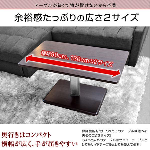 材質 MDF 強化フィルム貼りサイズ 90cmモデル(9050):幅900×奥500×高430~570120cmモデル(12060):幅1200×奥600×高430~570色 ブラウン特徴 【輸入品】【組み立て品】・ガスの力で高さが上下する昇降式テーブル・お好みのソファーに合わせて高さを自由に変えられます・移動も楽々キャスター付き・大きすぎず使いやすい大きさ送料 【送料無料】ただし、北海道・東北地域は追加送料(税別)が必要となります。(沖縄・離島は別途お見積り)また、開梱設置サービスをご利用の場合、送料とは別に料金が必要です。 ご注文前にお問い合せください。※追加料金が必要な場合、買い物カゴでは再計算されません。料金確定後、こちらからご連絡させていただきます。
