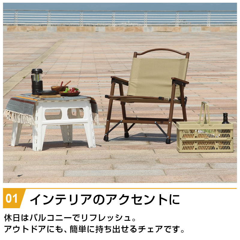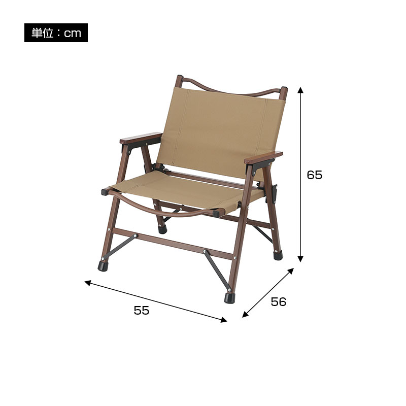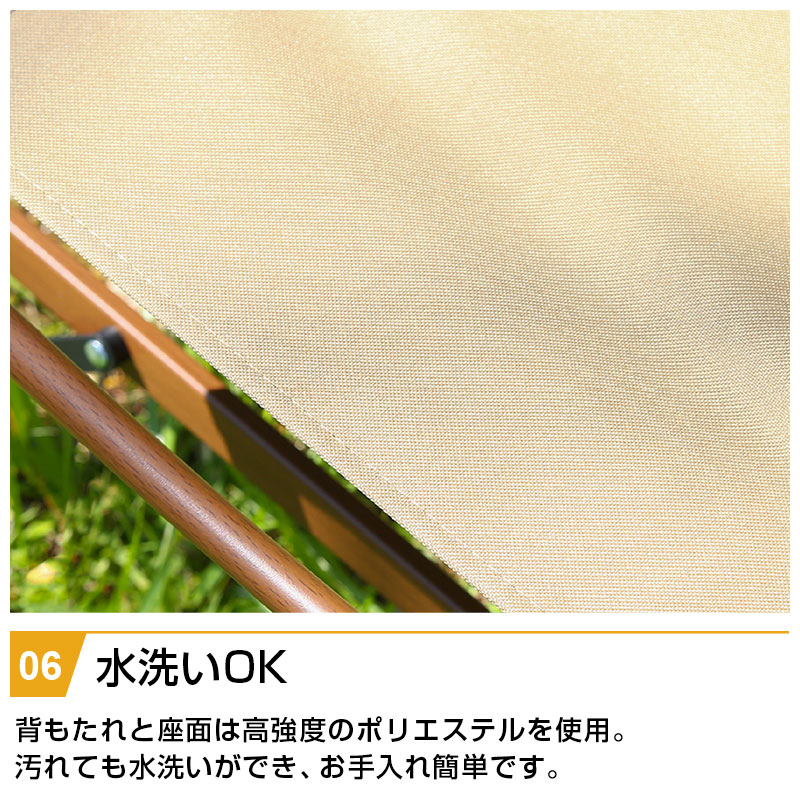 | 特徴 | ・インテリアのアクセントになるアウトドア風インテリア ・楽な姿勢でゆったりと座れるロースタイルチェア ・折りたたんで厚さ9.5cmまでコンパクトに ・重さ2.6kgと軽々と持ち運びできる ・手触りの良い天然木の肘掛け ・汚れても水洗いができ、お手入れ簡単 |