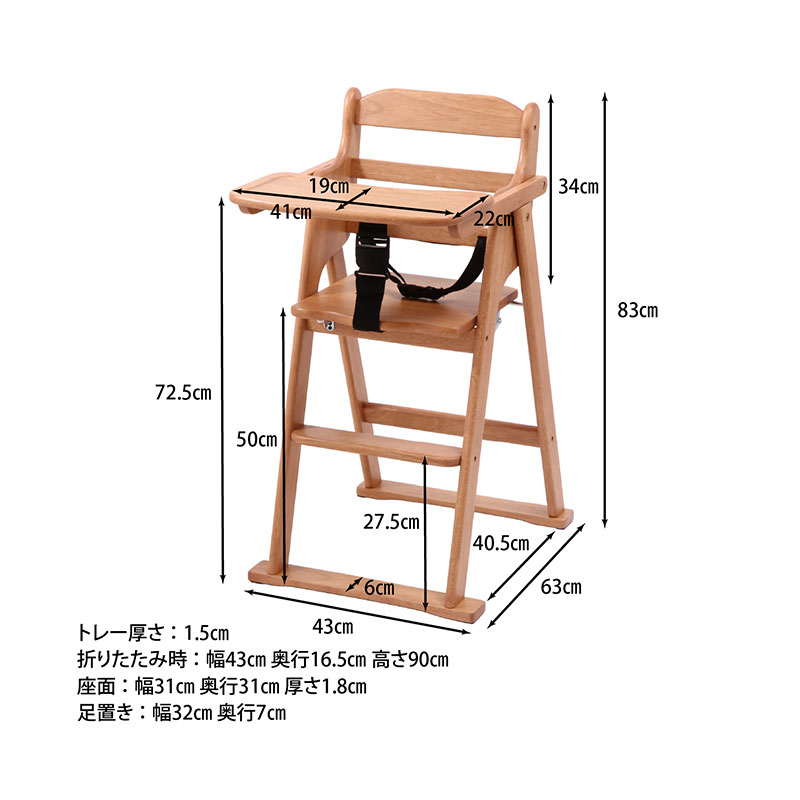 ■カラー ナチュラル、ブラウン ■サイズ(cm) 幅43×奥行63×高さ83 座面高:50.5 耐荷重(座面):30kg 折りたたみサイズ:幅43×奥行20×高さ90 トレー部分サイズ:幅41×奥行20×高さ1.5 ■重量 7kg ■材質 構造部材:天然木(ラバーウッド) 表面加工:ラッカー塗装 実物に近い状態で撮影していますが、撮影時の光の加減やお客様のPC設定により若干の色合いが異なる場合がございます。 曲線部分や若干の個体差により、多少の誤差が生じることがございます。予めご了承ください。 【送料無料】 ただし、北海道・沖縄・離島は追加送料が必要となります。 ※追加料金が必要な場合、買い物カゴでは再計算されません。料金確定後、こちらからご連絡させていただきます。 【キーワード】 キッズ 赤ちゃん 子ども 子供 コンパクト イス 椅子 テーブルチェア 高さ調節 食事 食事用 子供用 乳児 出産祝い 誕生日 プレゼント ギフト 子供家具 ダイニング