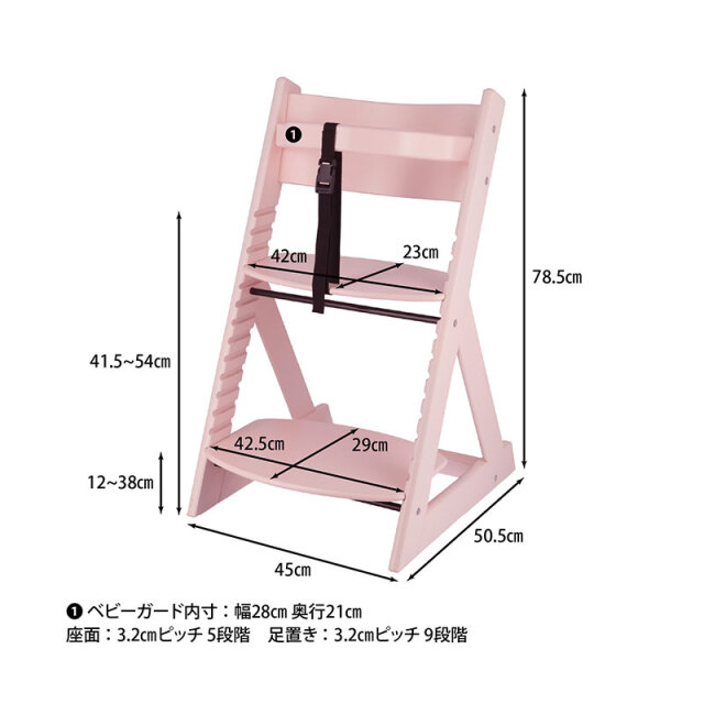 | サイズ(cm) | 幅45×奥行50.5×高さ78.5 座面高:41.5?54 耐荷重(座面):50kg 対象年齢:6か月-5歳 座面板サイズ:幅42×奥行23×高さ1.2 シートハイ:41.5-54 フットハイ(足置き):12-38 |