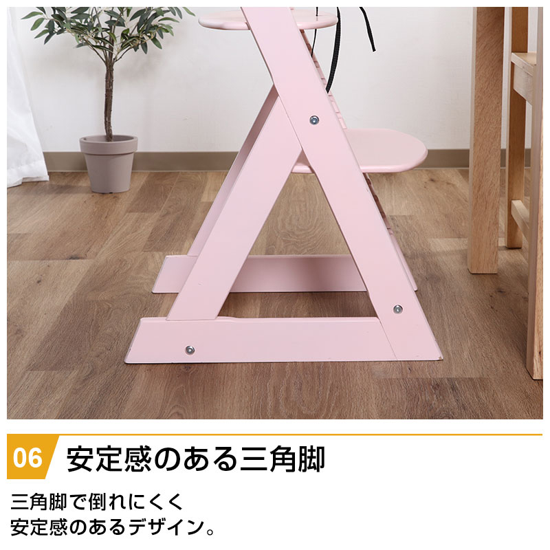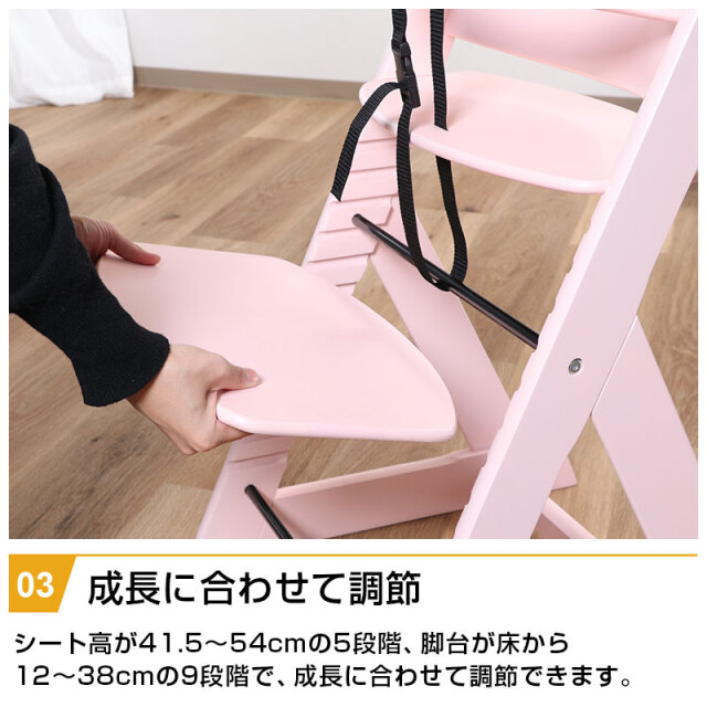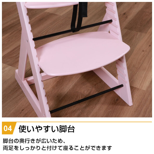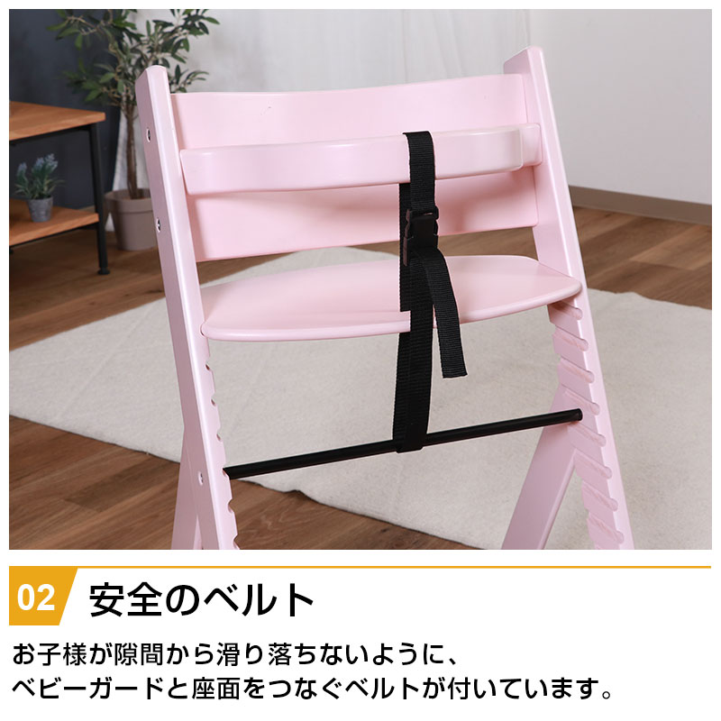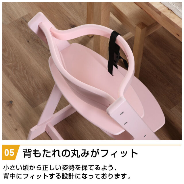 | 特徴 | ・角で怪我をしないように面取り加工をし、丸みを帯びた柔らかいデザイン ・ずり落ち防止のベルトで安心 ・成長に合わせて高さを5段階、脚台を9段階調節 ・脚台の奥行きが広いため、両足をしっかりと付けて座ることができる ・背もたれの丸みが背中にフィット ・安定感のある三角脚 |
