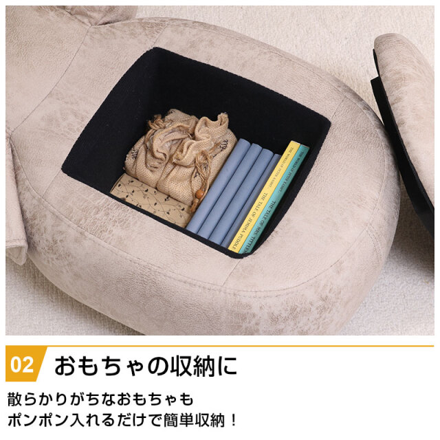 | 特徴 | ・かわいらしい表情でお部屋を明るく ・散らかりがちなおもちゃを簡単収納 ・丈夫な作りなので大人でも安心して座れる ・軽量設計で持ち運びラクラク ・ソファと合わせるとオットマンとしても活躍 ・玄関口に置くと靴の脱ぎ履きする際に便利 |