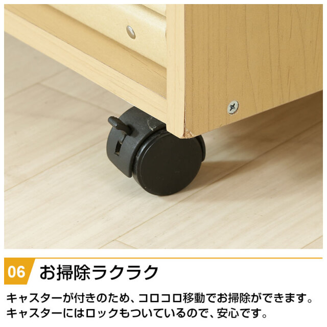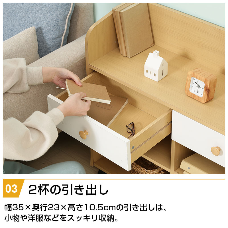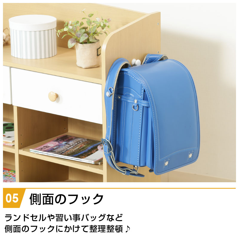 | 特徴 | ・ナチュラル色で大きくなっても使えるデザイン ・広々としたトップラックは本棚としても使える ・大きい引出しは小物や洋服などをすっきり収納 ・ラックの下部は置くものによって自由に動かせる可動棚 ・ランドセルや習い事バッグなど側面のフックにかけて整理整頓 ・キャスター付きだからお掃除ラクラク |