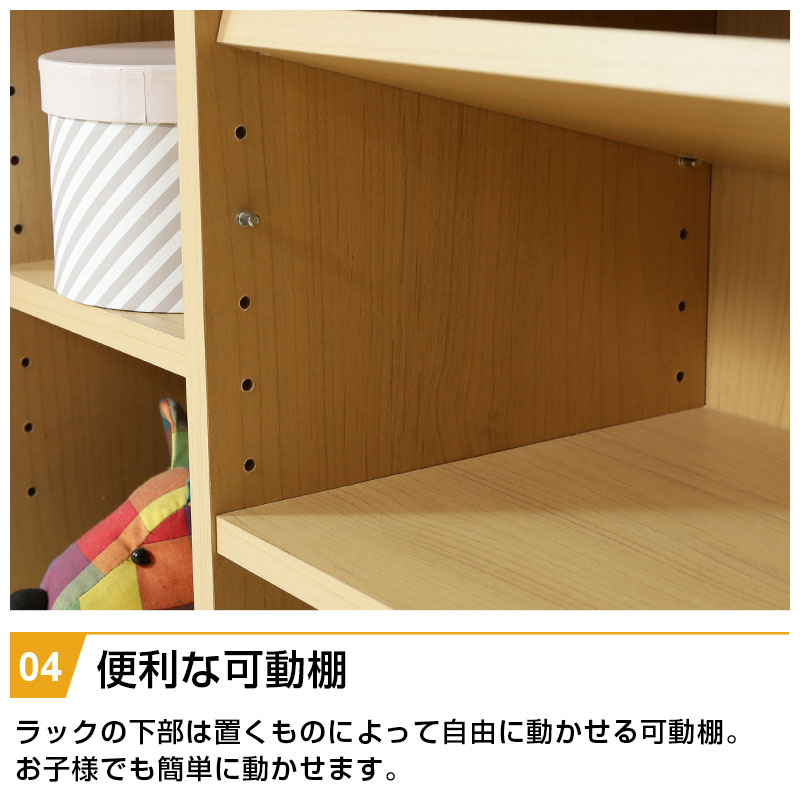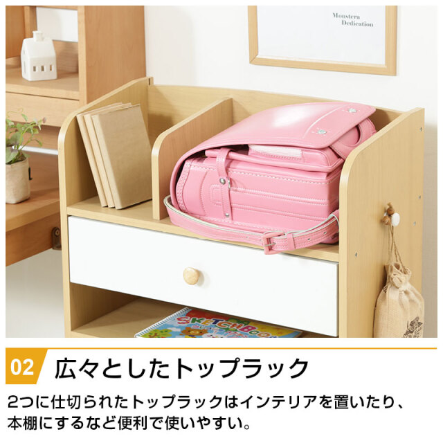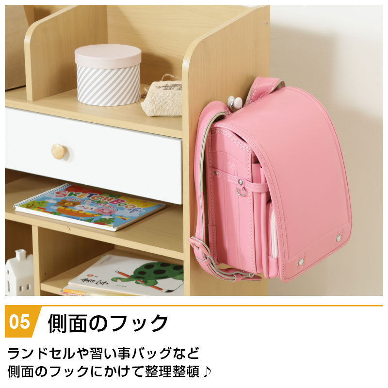 | 特徴 | ・ナチュラル色で大きくなっても使えるデザイン ・広々としたトップラックは本棚としても使える ・大きい引出しは小物や洋服などをすっきり収納 ・ラックの下部は置くものによって自由に動かせる可動棚 ・ランドセルや習い事バッグなど側面のフックにかけて整理整頓 ・キャスター付きだからお掃除ラクラク |