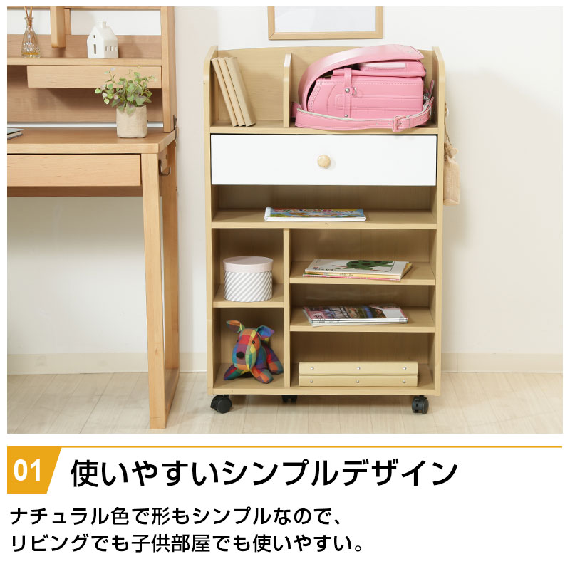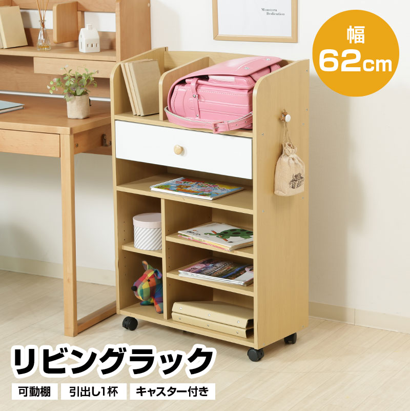 | 製品名: | リビングラック キャスター付き 幅62cm 引出し1杯 可動棚 ランドセル置き 収納 木製 キッズ 子供 おしゃれ おすすめ 人気 子供家具 収納家具 |