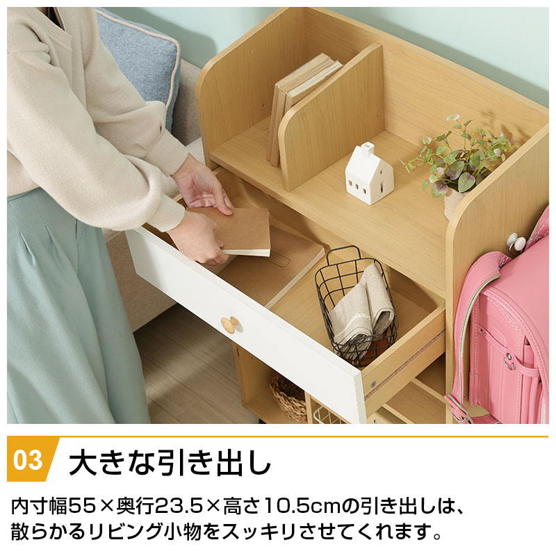 ■カラー ナチュラル ■サイズ(cm) 幅62×奥行29×高さ97 耐荷重(全体):20kg 耐荷重(棚板):5kg 引出内寸:幅55×奥行23.5×高さ10.5 ■重量 18kg ■材質 表面材:プリント紙化粧繊維板 実物に近い状態で撮影していますが、撮影時の光の加減やお客様のPC設定により若干の色合いが異なる場合がございます。 曲線部分や若干の個体差により、多少の誤差が生じることがございます。予めご了承ください。 【送料無料】 ただし、北海道・沖縄・離島は追加送料が必要となります。 ※追加料金が必要な場合、買い物カゴでは再計算されません。料金確定後、こちらからご連絡させていただきます。 【キーワード】 ラック 本棚 小学生 レッスンバッグ 子供部屋 教科書 入学 入園 準備 高さ調節 子供用 ベビー ベビー服 オムツ 赤ちゃん 誕生日 プレゼント ギフト リビング ランドセル収納 収納ワゴン おもちゃ収納 キッズ収納