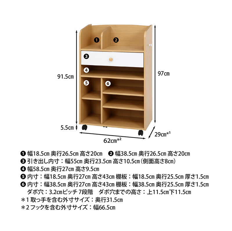 | サイズ(cm) | 幅62×奥行29×高さ97 耐荷重(全体):20kg 耐荷重(棚板):5kg 引出内寸:幅55×奥行23.5×高さ10.5 |