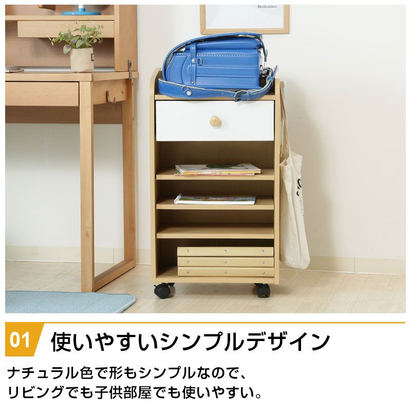 ■カラー ナチュラル ■サイズ(cm) 幅41.5×奥行29×高さ75 耐荷重(全体):20kg 耐荷重(棚板):5kg 引出内寸:幅35×奥行23×高さ10.5(8) ■重量 11kg ■材質 表面材:プリント紙化粧繊維板 実物に近い状態で撮影していますが、撮影時の光の加減やお客様のPC設定により若干の色合いが異なる場合がございます。 曲線部分や若干の個体差により、多少の誤差が生じることがございます。予めご了承ください。 【送料無料】 ただし、北海道・沖縄・離島は追加送料が必要となります。 ※追加料金が必要な場合、買い物カゴでは再計算されません。料金確定後、こちらからご連絡させていただきます。 【キーワード】 ラック 本棚 小学生 レッスンバッグ 子供部屋 教科書 入学 入園 準備 高さ調節 子供用 ベビー ベビー服 オムツ 赤ちゃん 誕生日 プレゼント ギフト リビング ランドセル収納 収納ワゴン おもちゃ収納 キッズ収納